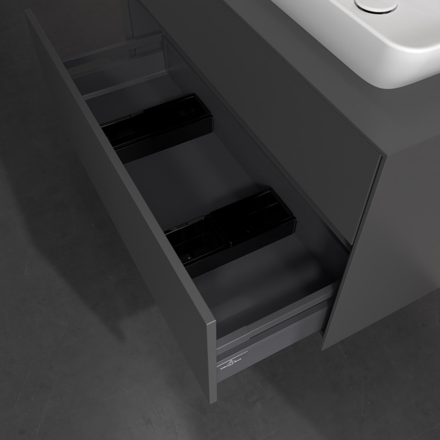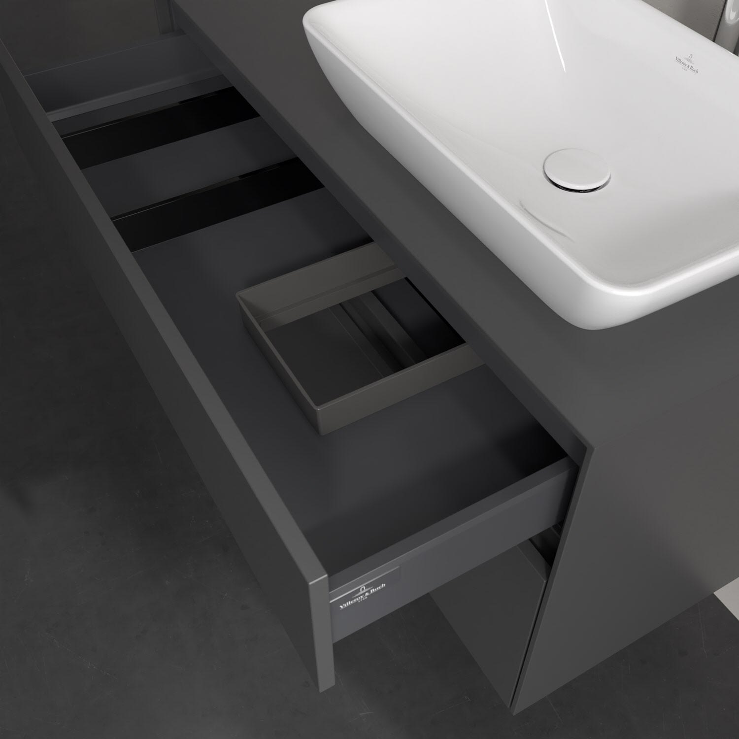 Zeitgemäßes Design und feine Linien: Der Villeroy & Boch Waschbeckenunterschrank aus der Collaro Kollektion mit zwei Auszügen glänzt mit vielen Vorzügen. Eine Griffleiste mit integrierter, stufenlos einstellbarer LED-Beleuchtung sorgt für eine schlichte, stimmungsvolle Front. Steuern lässt sich das Licht über einen Touch-Sensor seitlich am Unterschrank. Im Inneren bietet das Möbelstück erstaunlich viel Komfort – ermöglicht durch großzügigen Stauraum und den integrierten Antirutschboden. Die variabel setzbaren Glasabtrennungen und die mitgelieferte Accessory Box bieten Badutensilien ausreichend Platz und sorgen für den nötigen Überblick. Dank SoftClosing und Selbsteinzug lassen sich die Auszüge nach der Nutzung lautlos schließen. Die Front ist mit einer hochwertigen Lackierung versehen, deren Anti-Fingerprint-Oberfläche unschönen Fingerabdrücken vorbeugt.