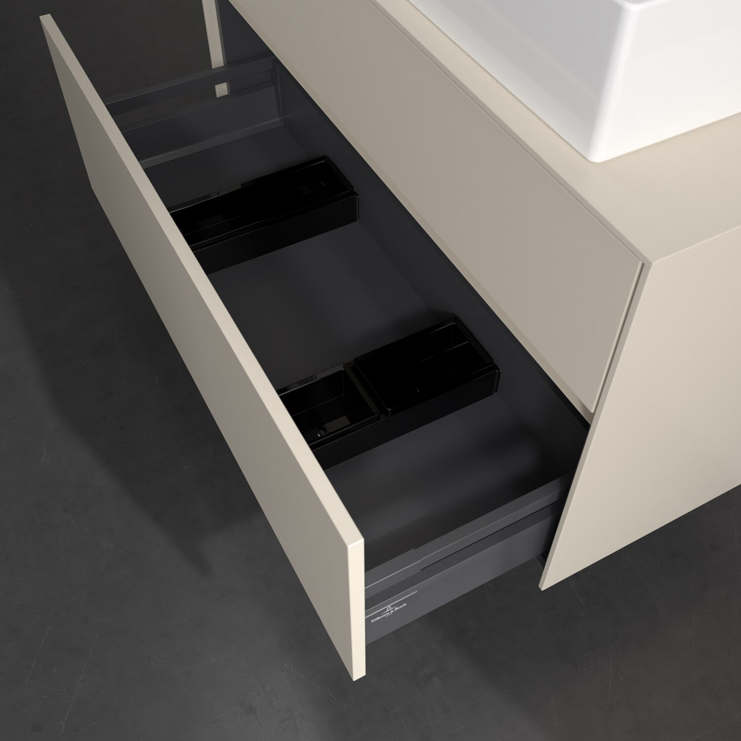 Zeitgemäßes Design und feine Linien: Der Villeroy & Boch Waschbeckenunterschrank aus der Collaro Kollektion mit zwei Auszügen glänzt mit vielen Vorzügen. Eine integrierte Griffleiste sorgt für eine schlichte, moderne Front. Im Inneren bietet das Möbelstück erstaunlich viel Komfort – ermöglicht durch großzügigen Stauraum und den integrierten Antirutschboden. Die variabel setzbaren Glasabtrennungen und die mitgelieferte Accessory Box bieten Badutensilien ausreichend Platz und sorgen für den nötigen Überblick. Dank SoftClosing und Selbsteinzug lassen sich die Auszüge nach der Nutzung lautlos schließen. Die Front ist mit einer hochwertigen Lackierung versehen, deren Anti-Fingerprint-Oberfläche unschönen Fingerabdrücken vorbeugt.