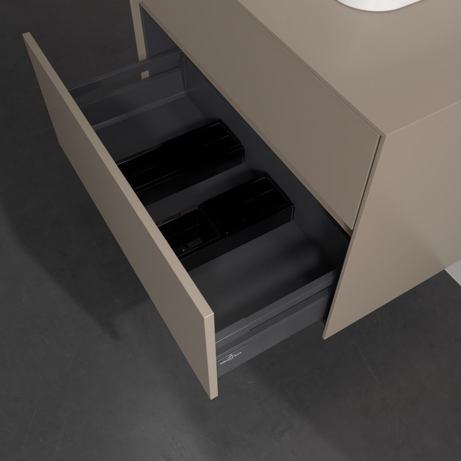 Zeitgemäßes Design und feine Linien: Der Villeroy & Boch Waschbeckenunterschrank aus der Collaro Kollektion mit zwei Auszügen glänzt mit vielen Vorzügen. Eine integrierte Griffleiste sorgt für eine schlichte, moderne Front. Im Inneren bietet das Möbelstück erstaunlich viel Komfort – ermöglicht durch großzügigen Stauraum und den integrierten Antirutschboden. Die variabel setzbaren Glasabtrennungen und die mitgelieferte Accessory Box bieten Badutensilien ausreichend Platz und sorgen für den nötigen Überblick. Dank SoftClosing und Selbsteinzug lassen sich die Auszüge nach der Nutzung lautlos schließen. Die Front ist mit einer hochwertigen Lackierung versehen, deren Anti-Fingerprint-Oberfläche unschönen Fingerabdrücken vorbeugt.