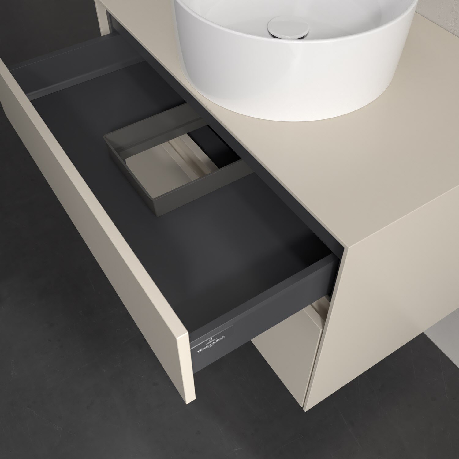 Zeitgemäßes Design und feine Linien: Der Villeroy & Boch Waschbeckenunterschrank aus der Collaro Kollektion mit zwei Auszügen glänzt mit vielen Vorzügen. Eine integrierte Griffleiste sorgt für eine schlichte, moderne Front. Im Inneren bietet das Möbelstück erstaunlich viel Komfort – ermöglicht durch großzügigen Stauraum und den integrierten Antirutschboden. Die variabel setzbaren Glasabtrennungen und die mitgelieferte Accessory Box bieten Badutensilien ausreichend Platz und sorgen für den nötigen Überblick. Dank SoftClosing und Selbsteinzug lassen sich die Auszüge nach der Nutzung lautlos schließen. Die Front ist mit einer hochwertigen Lackierung versehen, deren Anti-Fingerprint-Oberfläche unschönen Fingerabdrücken vorbeugt.