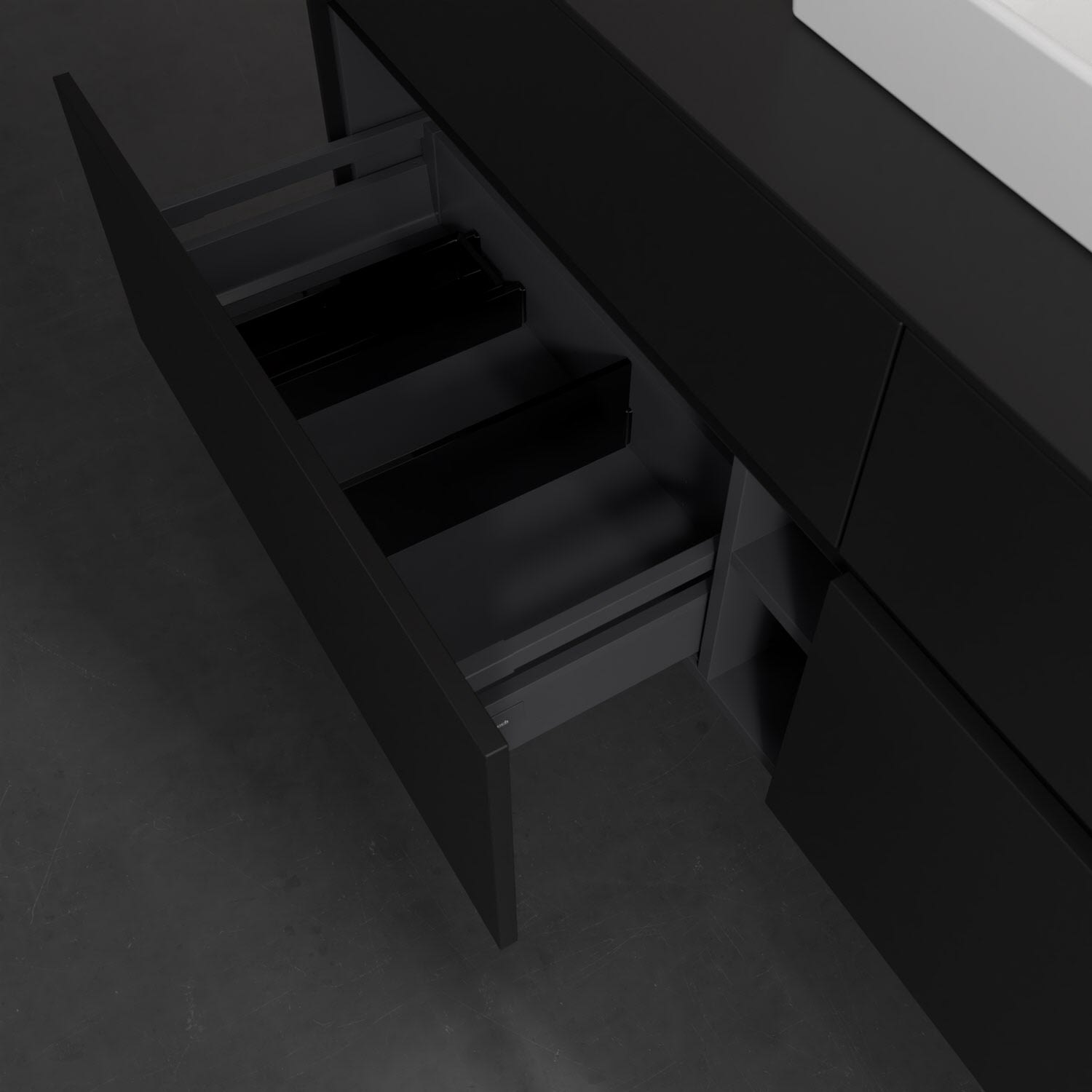 - kein Umfallen oder Verrutschen von Pflegeprodukten in den Schubladen dank rutschhemmendem Boden