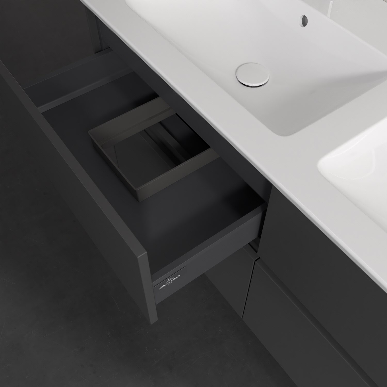 Stauraumwunder im zeitgemäßen Design: Der Villeroy & Boch Waschbeckenunterschrank aus der Collaro Kollektion eignet sich besonders für Familienbäder und bietet genau den Platz, der dort benötigt wird. Eine integrierte Griffleiste sorgt für eine schlichte, moderne Front. Im Inneren bietet das Möbelstück mit vier Auszügen erstaunlich viel Komfort – ermöglicht durch großzügiges Platzangebot und den integrierten Antirutschboden. Variabel setzbare Glasabtrennungen und mitgelieferte Accessory Boxen sorgen für den nötigen Überblick. Dank SoftClosing und Selbsteinzug lassen sich die Auszüge nach der Nutzung lautlos schließen. Die Front ist mit einer hochwertigen Lackierung versehen, deren Anti-Fingerprint-Oberfläche unschönen Fingerabdrücken vorbeugt.
