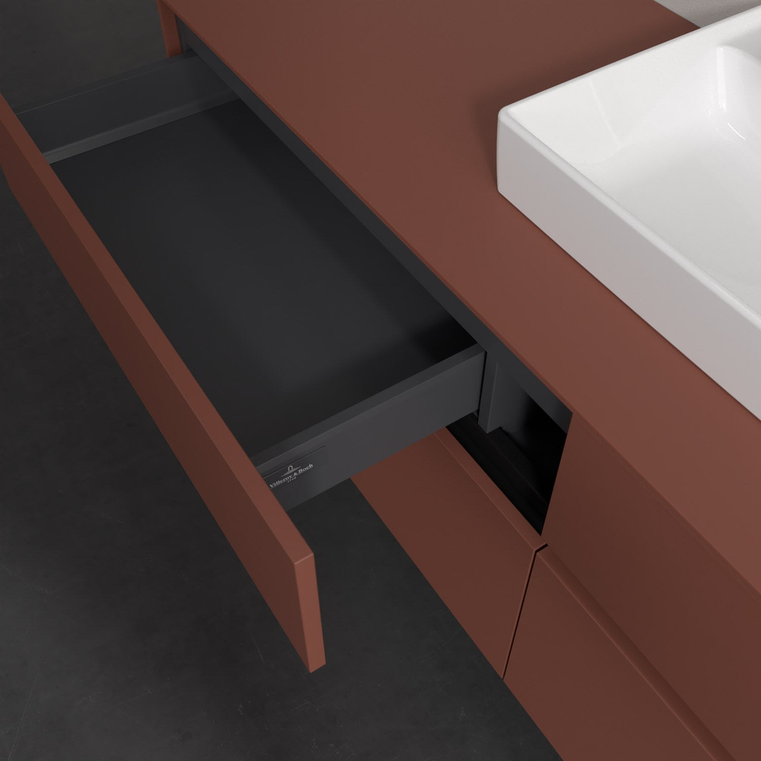 Stauraumwunder im zeitgemäßen Design: Der Villeroy & Boch Waschbeckenunterschrank aus der Collaro Kollektion eignet sich besonders für Familienbäder und bietet genau den Platz, der dort benötigt wird. Stimmungsvolles Highlight der schlichten, modernen Front ist die integrierte Griffmulde mit stufenlos einstellbarer LED-Beleuchtung. Im Inneren bietet das Möbelstück mit vier Auszügen erstaunlich viel Komfort – ermöglicht durch großzügiges Platzangebot und den integrierten Antirutschboden. Variabel setzbare Glasabtrennungen und mitgelieferte Accessory Boxen sorgen für den nötigen Überblick. Dank SoftClosing und Selbsteinzug lassen sich die Auszüge nach der Nutzung lautlos schließen. Die Front ist mit einer hochwertigen Lackierung versehen, deren Anti-Fingerprint-Oberfläche unschönen Fingerabdrücken vorbeugt.