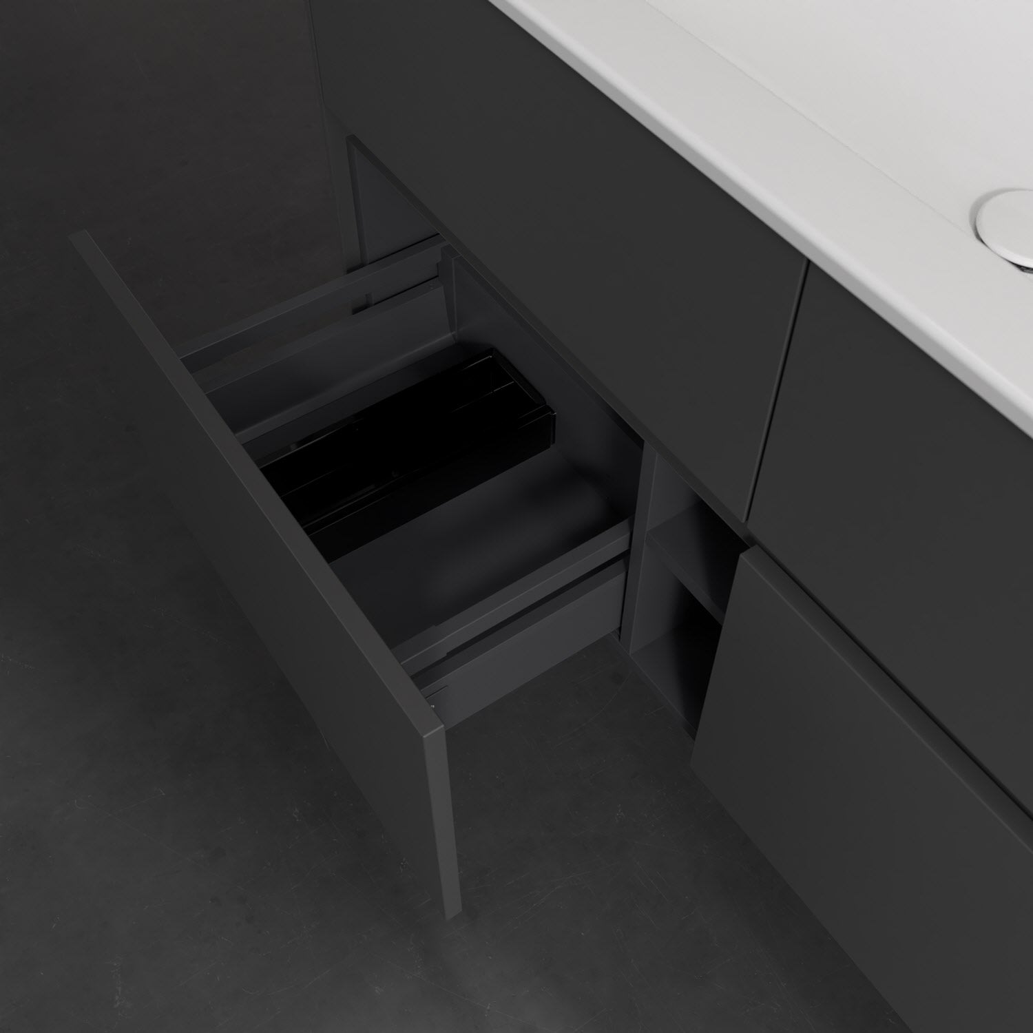 Stauraumwunder im zeitgemäßen Design: Der Villeroy & Boch Waschbeckenunterschrank aus der Collaro Kollektion eignet sich besonders für Familienbäder und bietet genau den Platz, der dort benötigt wird. Eine integrierte Griffleiste sorgt für eine schlichte, moderne Front. Im Inneren bietet das Möbelstück mit vier Auszügen erstaunlich viel Komfort – ermöglicht durch großzügiges Platzangebot und den integrierten Antirutschboden. Variabel setzbare Glasabtrennungen und mitgelieferte Accessory Boxen sorgen für den nötigen Überblick. Dank SoftClosing und Selbsteinzug lassen sich die Auszüge nach der Nutzung lautlos schließen. Die Front ist mit einer hochwertigen Lackierung versehen, deren Anti-Fingerprint-Oberfläche unschönen Fingerabdrücken vorbeugt.