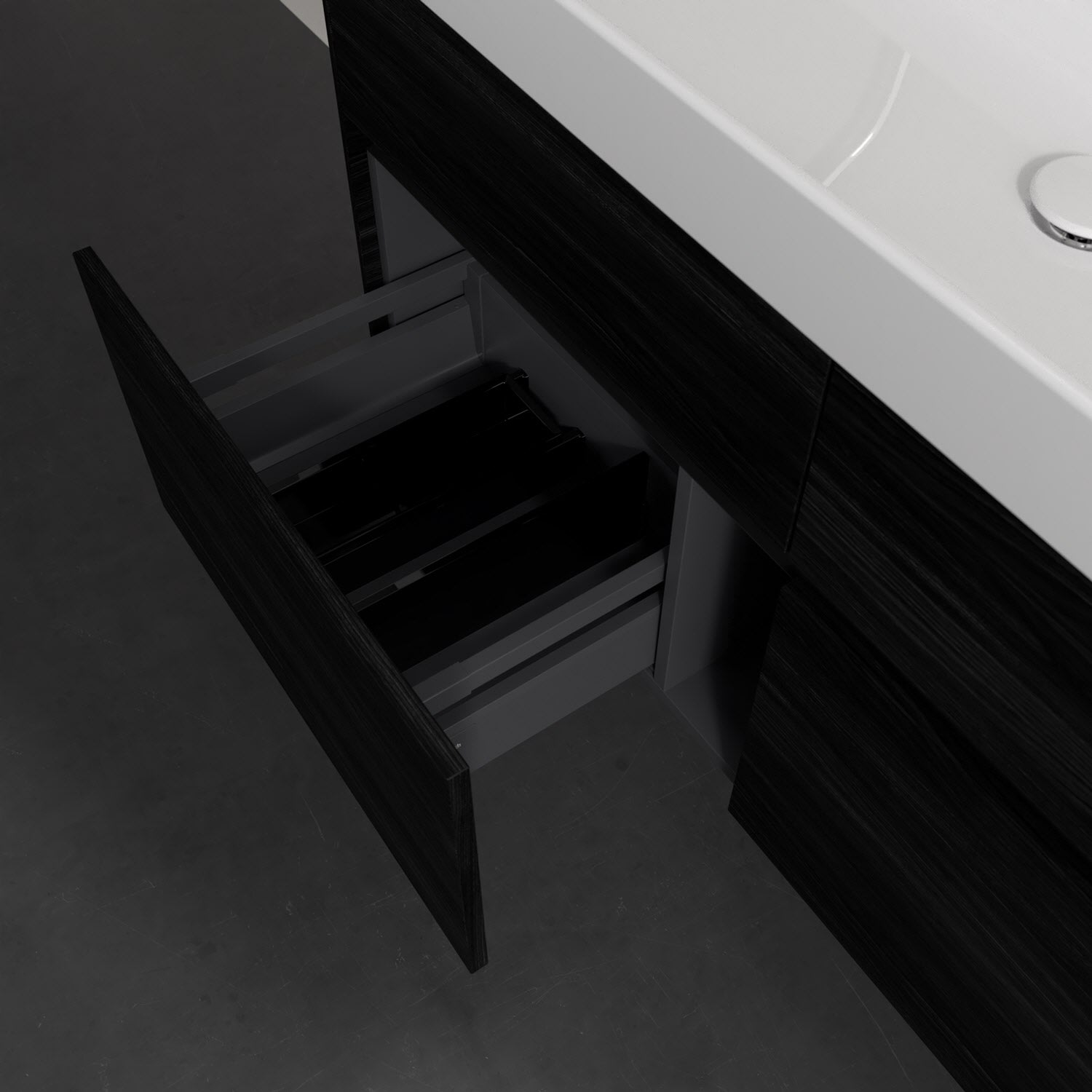 - kein Umfallen oder Verrutschen von Pflegeprodukten in den Schubladen dank rutschhemmendem Boden