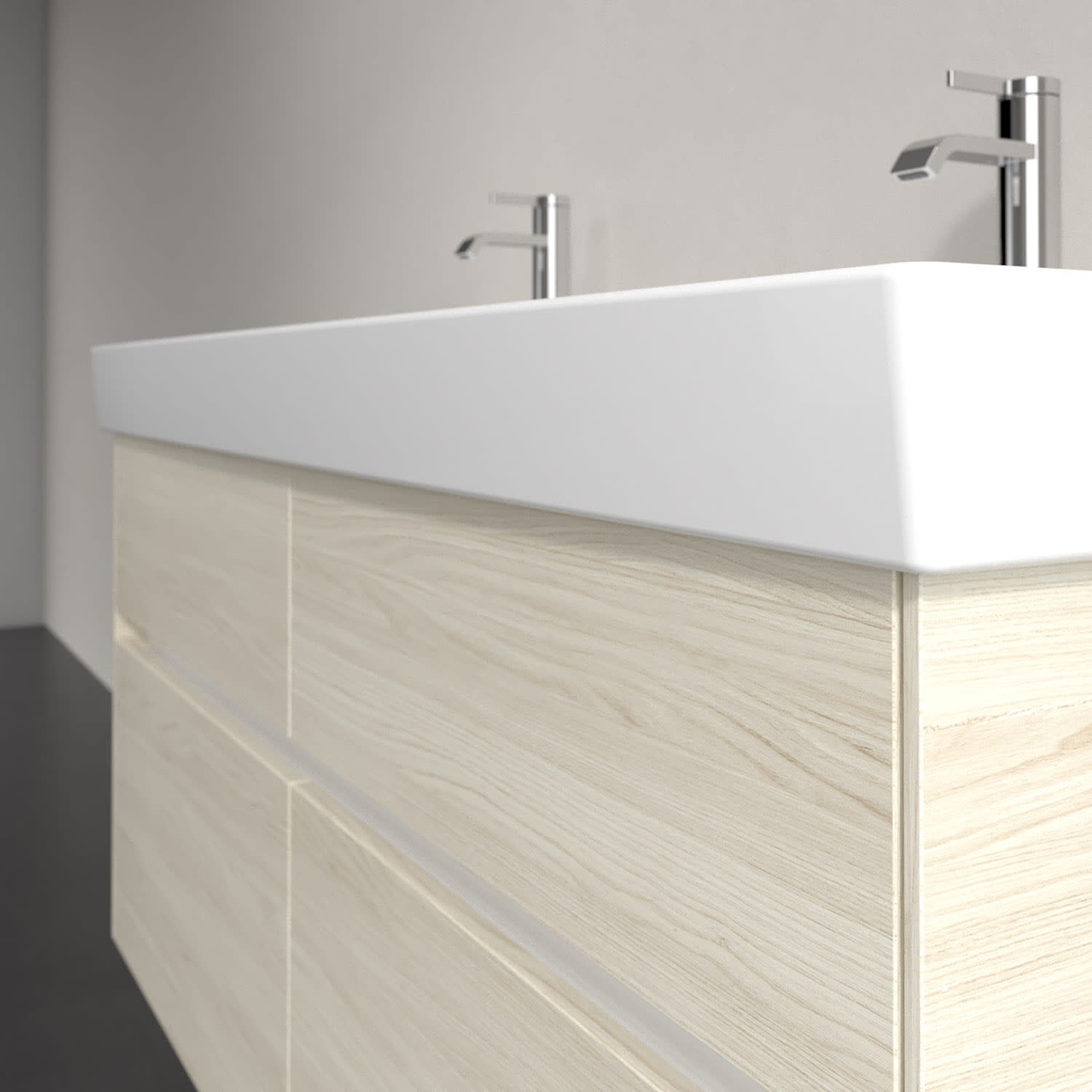 Stauraumwunder im zeitgemäßen Design: Der Villeroy & Boch Waschbeckenunterschrank aus der Collaro Kollektion eignet sich besonders für Familienbäder und bietet genau den Platz, der dort benötigt wird. Stimmungsvolles Highlight der schlichten, modernen Front ist die integrierte Griffmulde mit stufenlos einstellbarer LED-Beleuchtung. Steuern lässt sie sich über einen Touch-Sensor seitlich am Unterschrank. Im Inneren bietet das Möbelstück mit vier Auszügen erstaunlich viel Komfort – ermöglicht durch großzügiges Platzangebot und den integrierten Antirutschboden. Variabel setzbare Glasabtrennungen und mitgelieferte Accessory Boxen sorgen für den nötigen Überblick. Dank SoftClosing und Selbsteinzug lassen sich die Auszüge nach der Nutzung lautlos schließen. Für eine besonders leichte Reinigung sorgt die pflegeleichte Direktbeschichtung.