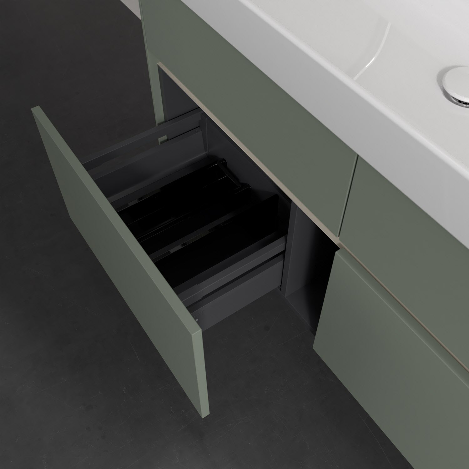 - kein Umfallen oder Verrutschen von Pflegeprodukten in den Schubladen dank rutschhemmendem Boden