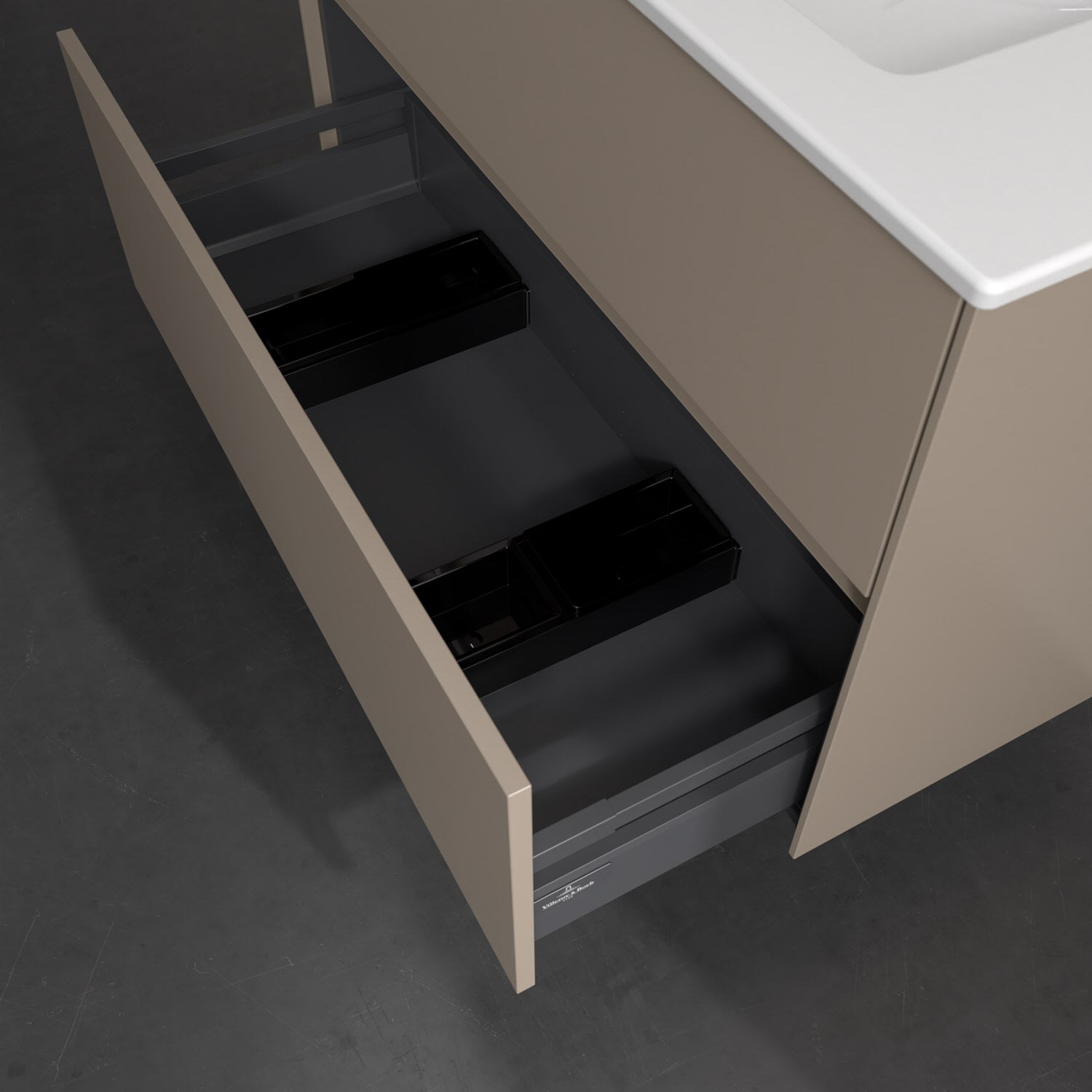 Zeitgemäßes Design und feine Linien: Der Villeroy & Boch Waschbeckenunterschrank aus der Collaro Kollektion mit zwei Auszügen glänzt mit vielen Vorzügen. Eine Griffleiste mit integrierter, stufenlos einstellbarer LED-Beleuchtung sorgt für eine schlichte, stimmungsvolle Front. Steuern lässt sich das Licht über einen Touch-Sensor seitlich am Unterschrank. Im Inneren bietet das Möbelstück erstaunlich viel Komfort – ermöglicht durch großzügigen Stauraum und den integrierten Antirutschboden. Die variabel setzbaren Glasabtrennungen und die mitgelieferte Accessory Box bieten Badutensilien ausreichend Platz und sorgen für den nötigen Überblick. Dank SoftClosing und Selbsteinzug lassen sich die Auszüge nach der Nutzung lautlos schließen. Die Front ist mit einer hochwertigen Lackierung versehen, deren Anti-Fingerprint-Oberfläche unschönen Fingerabdrücken vorbeugt.
