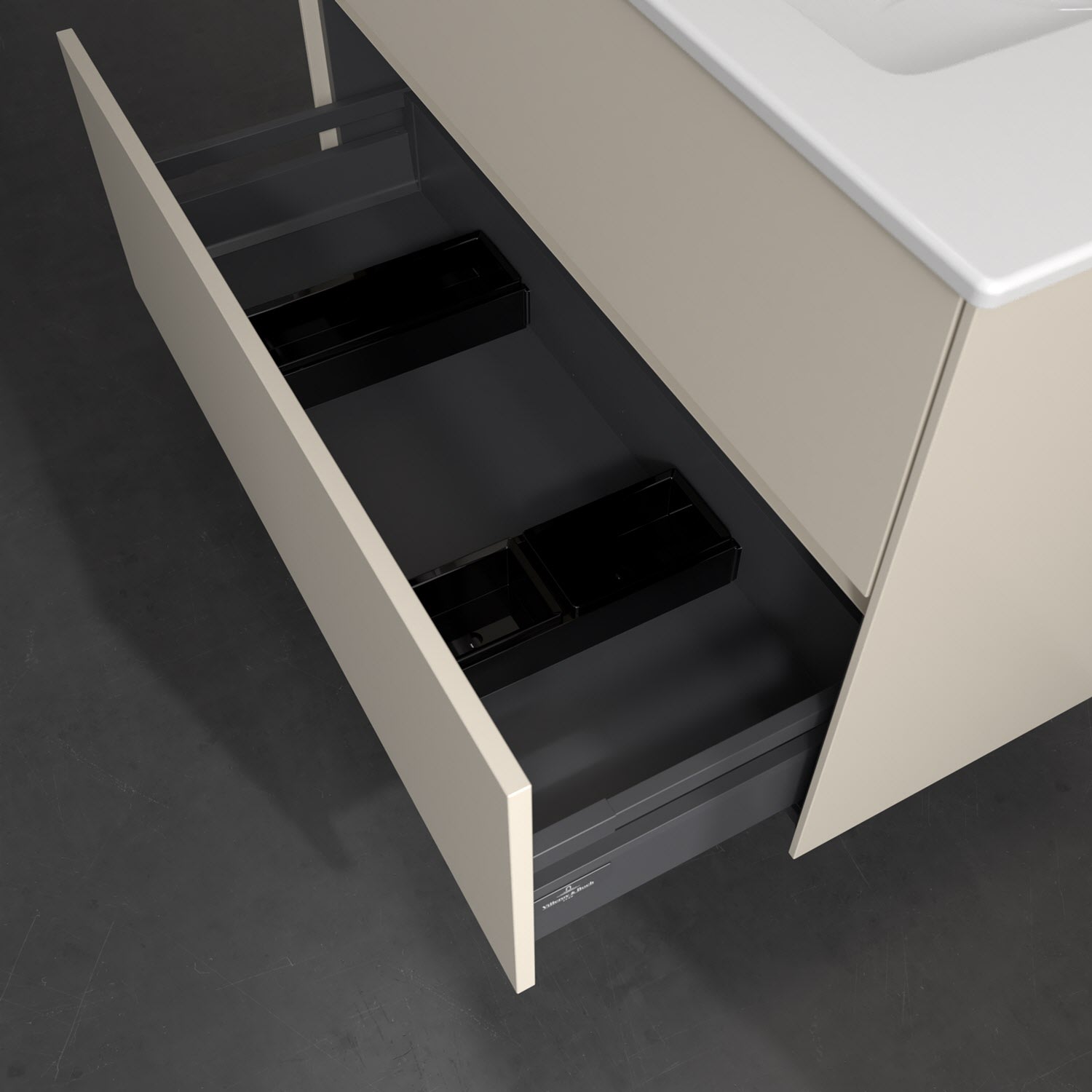 Zeitgemäßes Design und feine Linien: Der Villeroy & Boch Waschbeckenunterschrank aus der Collaro Kollektion mit zwei Auszügen glänzt mit vielen Vorzügen. Eine Griffleiste mit integrierter, stufenlos einstellbarer LED-Beleuchtung sorgt für eine schlichte, stimmungsvolle Front. Steuern lässt sich das Licht über einen Touch-Sensor seitlich am Unterschrank. Im Inneren bietet das Möbelstück erstaunlich viel Komfort – ermöglicht durch großzügigen Stauraum und den integrierten Antirutschboden. Die variabel setzbaren Glasabtrennungen und die mitgelieferte Accessory Box bieten Badutensilien ausreichend Platz und sorgen für den nötigen Überblick. Dank SoftClosing und Selbsteinzug lassen sich die Auszüge nach der Nutzung lautlos schließen. Die Front ist mit einer hochwertigen Lackierung versehen, deren Anti-Fingerprint-Oberfläche unschönen Fingerabdrücken vorbeugt.