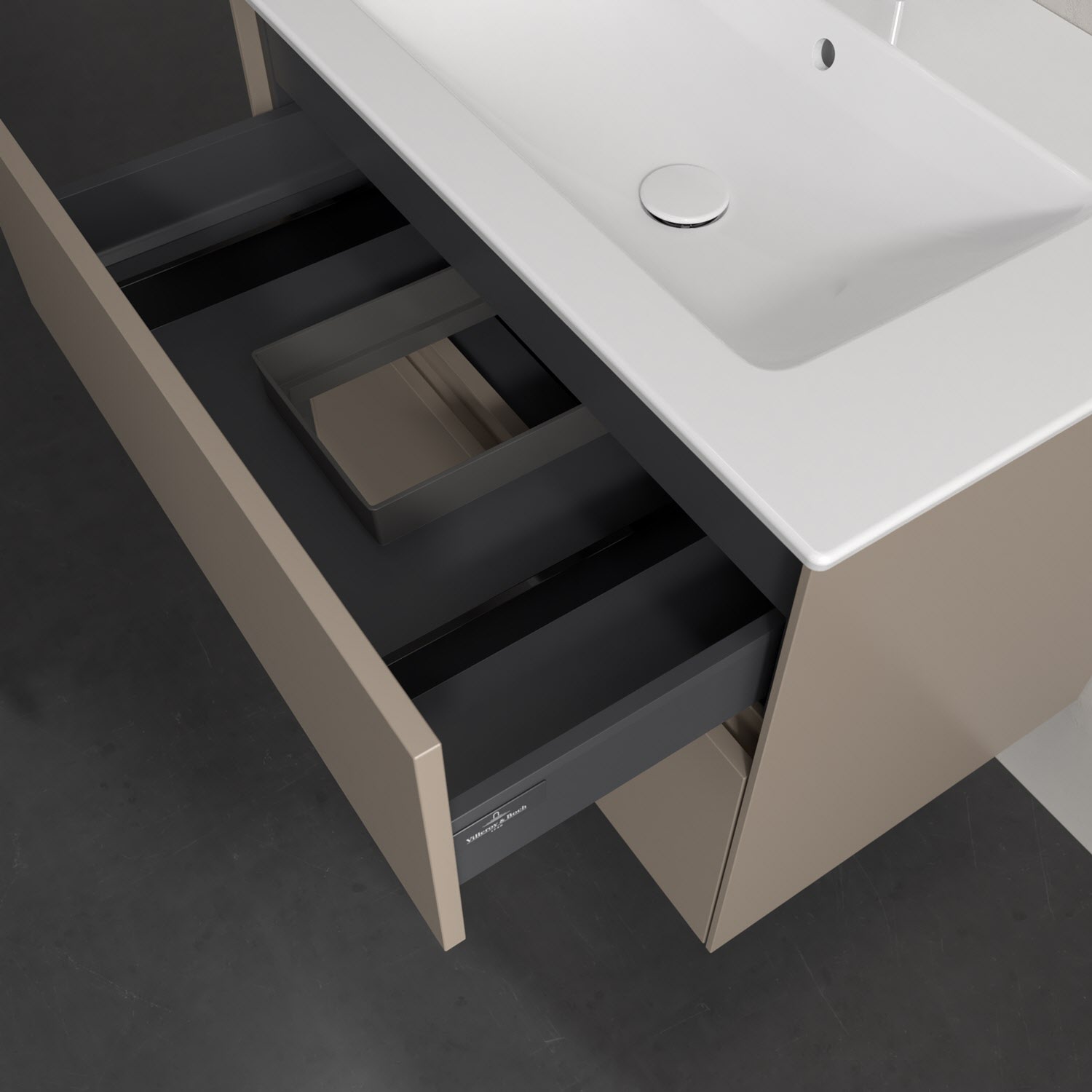 Kompaktes Design und feine Linien: Der Villeroy & Boch Waschbeckenunterschrank aus der Collaro Kollektion mit zwei Auszügen passt perfekt in kleine Bäder oder Gästebäder. Eine integrierte Griffleiste sorgt für eine schlichte, moderne Front. Im Inneren bietet das Möbelstück erstaunlich viel Komfort – ermöglicht durch großzügigen Stauraum und den integrierten Antirutschboden. Die mitgelieferte Accessory Box bietet kleinen Badutensilien oder Kosmetik Platz und sorgt so für den nötigen Überblick. Dank SoftClosing und Selbsteinzug lassen sich die Auszüge nach der Nutzung lautlos schließen. Die Front ist mit einer hochwertigen Lackierung versehen, deren Anti-Fingerprint-Oberfläche unschönen Fingerabdrücken vorbeugt.