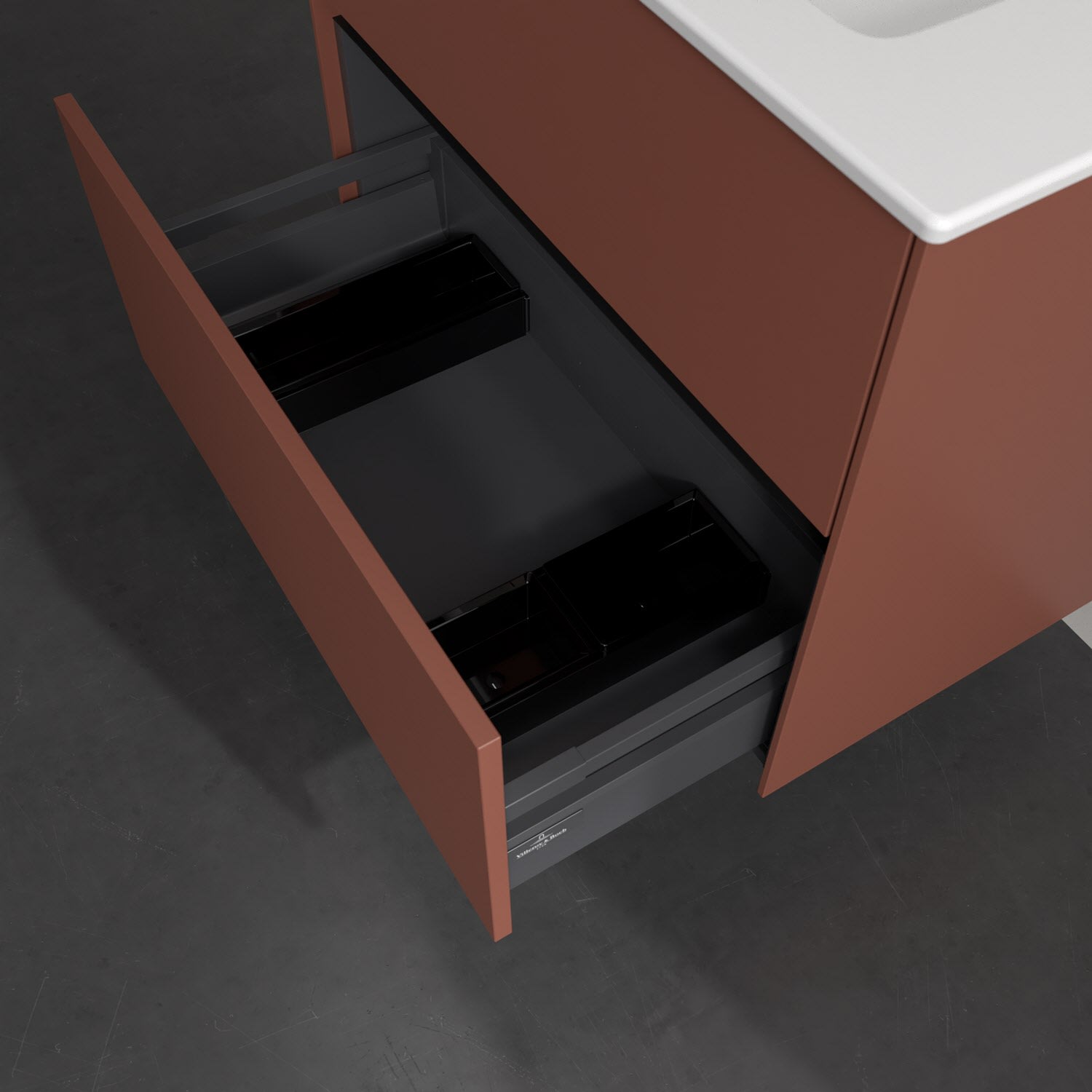Kompaktes Design und feine Linien: Der Villeroy & Boch Waschbeckenunterschrank aus der Collaro Kollektion mit zwei Auszügen passt perfekt in kleine Bäder oder Gästebäder. Eine integrierte Griffleiste sorgt für eine schlichte, moderne Front. Im Inneren bietet das Möbelstück erstaunlich viel Komfort – ermöglicht durch großzügigen Stauraum und den integrierten Antirutschboden. Die mitgelieferte Accessory Box bietet kleinen Badutensilien oder Kosmetik Platz und sorgt so für den nötigen Überblick. Dank SoftClosing und Selbsteinzug lassen sich die Auszüge nach der Nutzung lautlos schließen. Die Front ist mit einer hochwertigen Lackierung versehen, deren Anti-Fingerprint-Oberfläche unschönen Fingerabdrücken vorbeugt.