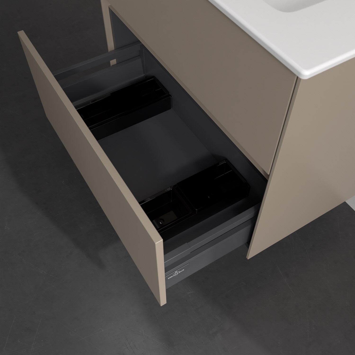 Kompaktes Design und feine Linien: Der Villeroy & Boch Waschbeckenunterschrank aus der Collaro Kollektion mit zwei Auszügen passt perfekt in kleine Bäder oder Gästebäder. Eine Griffleiste mit integrierter, stufenlos einstellbarer LED-Beleuchtung sorgt für eine schlichte, stimmungsvolle Front. Steuern lässt sich das Licht über einen Touch-Sensor seitlich am Unterschrank. Im Inneren bietet das Möbelstück erstaunlich viel Komfort – ermöglicht durch großzügigen Stauraum und den integrierten Antirutschboden. Die mitgelieferte Accessory Box bietet kleinen Badutensilien oder Kosmetik Platz und sorgt so für den nötigen Überblick. Dank SoftClosing und Selbsteinzug lassen sich die Auszüge nach der Nutzung lautlos schließen. Die Front ist mit einer hochwertigen Lackierung versehen, deren Anti-Fingerprint-Oberfläche unschönen Fingerabdrücken vorbeugt.