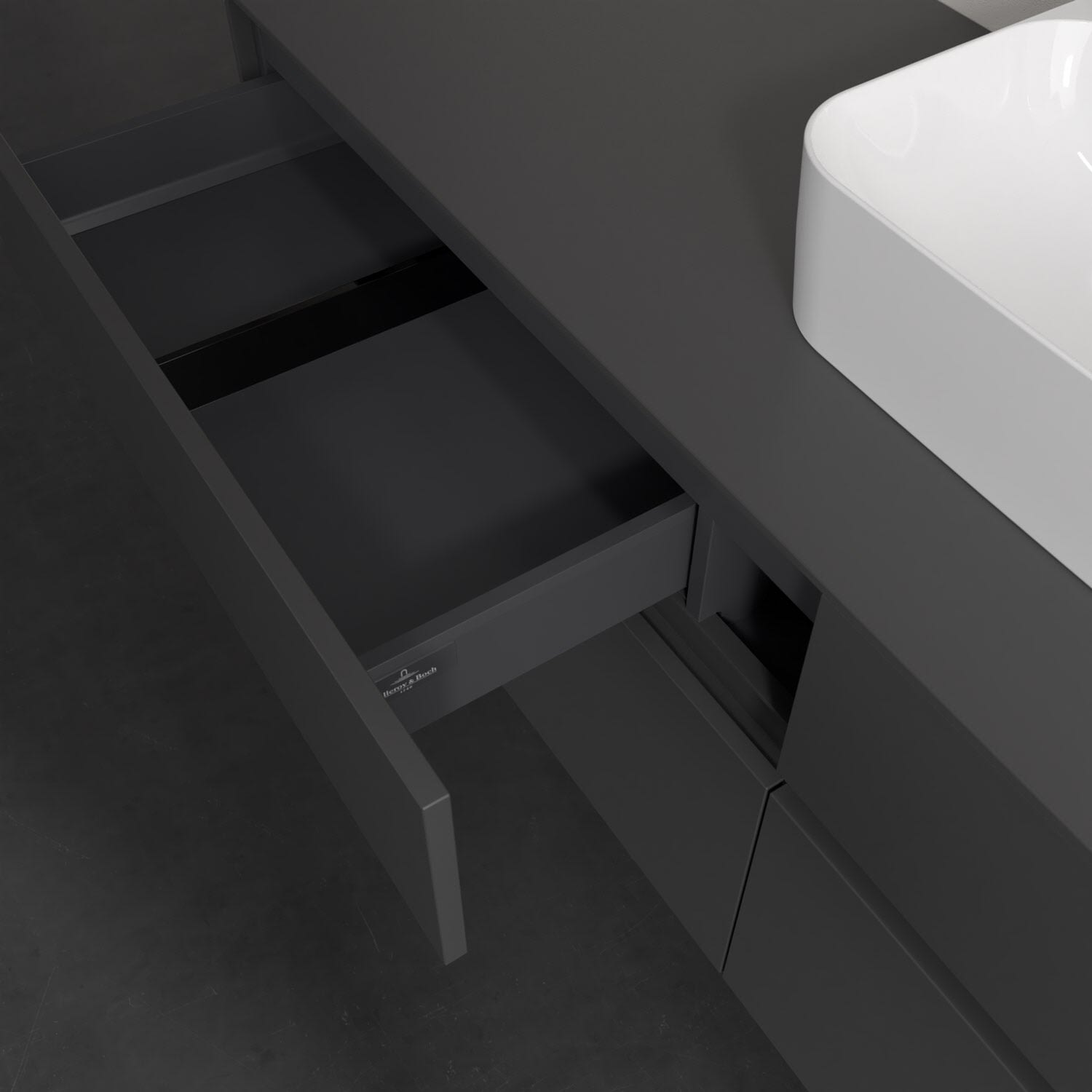 Stauraumwunder im zeitgemäßen Design: Der Villeroy & Boch Waschbeckenunterschrank aus der Collaro Kollektion eignet sich besonders für Familienbäder und bietet genau den Platz, der dort benötigt wird. Stimmungsvolles Highlight der schlichten, modernen Front ist die integrierte Griffmulde mit stufenlos einstellbarer LED-Beleuchtung. Im Inneren bietet das Möbelstück mit vier Auszügen erstaunlich viel Komfort – ermöglicht durch großzügiges Platzangebot und den integrierten Antirutschboden. Variabel setzbare Glasabtrennungen und mitgelieferte Accessory Boxen sorgen für den nötigen Überblick. Dank SoftClosing und Selbsteinzug lassen sich die Auszüge nach der Nutzung lautlos schließen. Die Front ist mit einer hochwertigen Lackierung versehen, deren Anti-Fingerprint-Oberfläche unschönen Fingerabdrücken vorbeugt.