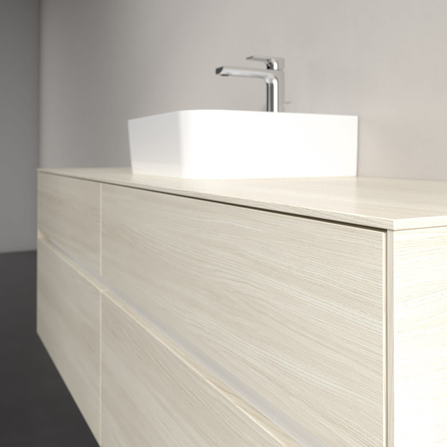 Stauraumwunder im zeitgemäßen Design: Der Villeroy & Boch Waschbeckenunterschrank aus der Collaro Kollektion eignet sich besonders für Familienbäder und bietet genau den Platz, der dort benötigt wird. Stimmungsvolles Highlight der schlichten, modernen Front ist die integrierte Griffmulde mit stufenlos einstellbarer LED-Beleuchtung. Im Inneren bietet das Möbelstück mit vier Auszügen erstaunlich viel Komfort – ermöglicht durch großzügiges Platzangebot und den integrierten Antirutschboden. Variabel setzbare Glasabtrennungen und mitgelieferte Accessory Boxen sorgen für den nötigen Überblick. Dank SoftClosing und Selbsteinzug lassen sich die Auszüge nach der Nutzung lautlos schließen. Für eine besonders leichte Reinigung sorgt die pflegeleichte Direktbeschichtung.