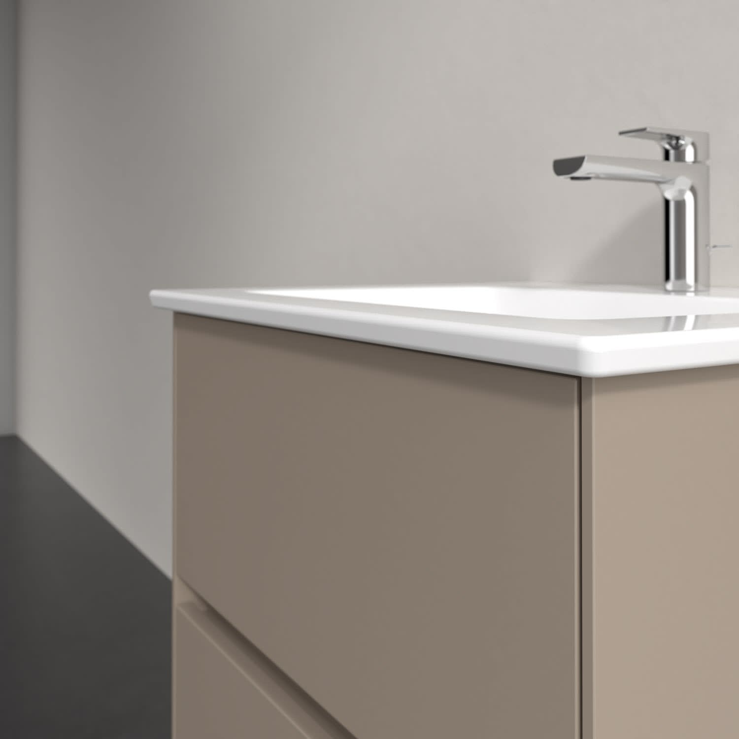 Kompaktes Design und feine Linien: Der Villeroy & Boch Waschbeckenunterschrank aus der Collaro Kollektion mit zwei Auszügen passt perfekt in kleine Bäder oder Gästebäder. Eine Griffleiste mit integrierter, stufenlos einstellbarer LED-Beleuchtung sorgt für eine schlichte, stimmungsvolle Front. Steuern lässt sich das Licht über einen Touch-Sensor seitlich am Unterschrank. Im Inneren bietet das Möbelstück erstaunlich viel Komfort – ermöglicht durch großzügigen Stauraum und den integrierten Antirutschboden. Die mitgelieferte Accessory Box bietet kleinen Badutensilien oder Kosmetik Platz und sorgt so für den nötigen Überblick. Dank SoftClosing und Selbsteinzug lassen sich die Auszüge nach der Nutzung lautlos schließen. Die Front ist mit einer hochwertigen Lackierung versehen, deren Anti-Fingerprint-Oberfläche unschönen Fingerabdrücken vorbeugt.
