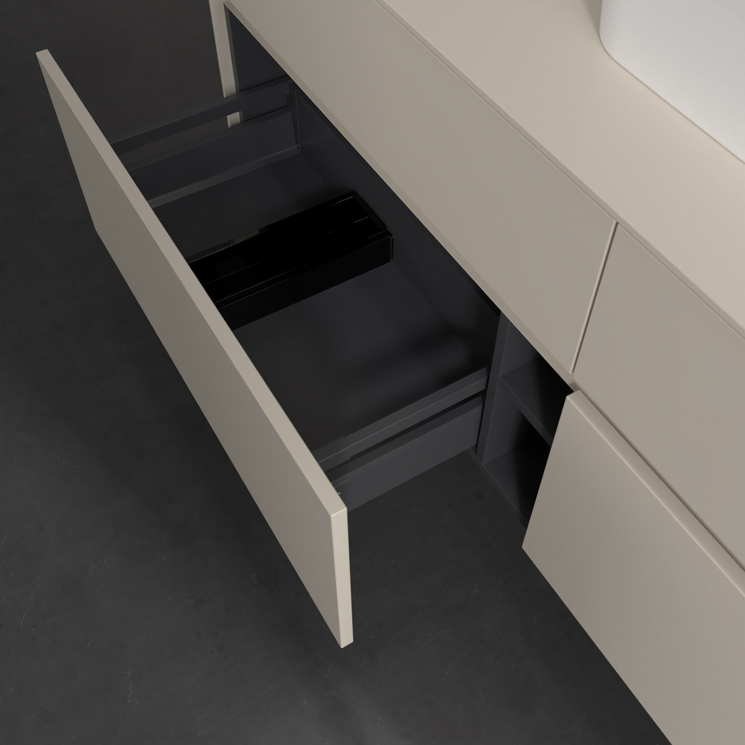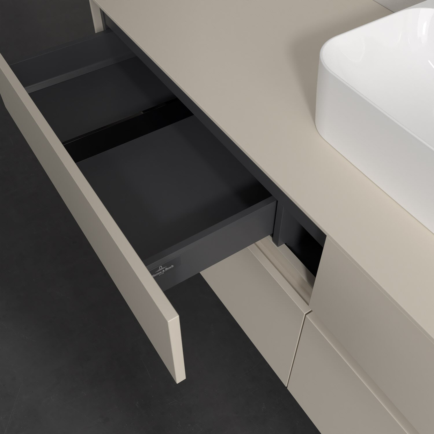 Stauraumwunder im zeitgemäßen Design: Der Villeroy & Boch Waschbeckenunterschrank aus der Collaro Kollektion eignet sich besonders für Familienbäder und bietet genau den Platz, der dort benötigt wird. Eine integrierte Griffleiste sorgt für eine schlichte, moderne Front. Steuern lässt sich das Licht über einen Touch-Sensor seitlich am Unterschrank. Im Inneren bietet das Möbelstück mit vier Auszügen erstaunlich viel Komfort – ermöglicht durch großzügiges Platzangebot und den integrierten Antirutschboden. Variabel setzbare Glasabtrennungen und mitgelieferte Accessory Boxen sorgen für den nötigen Überblick. Dank SoftClosing und Selbsteinzug lassen sich die Auszüge nach der Nutzung lautlos schließen. Die Front ist mit einer hochwertigen Lackierung versehen, deren Anti-Fingerprint-Oberfläche unschönen Fingerabdrücken vorbeugt.