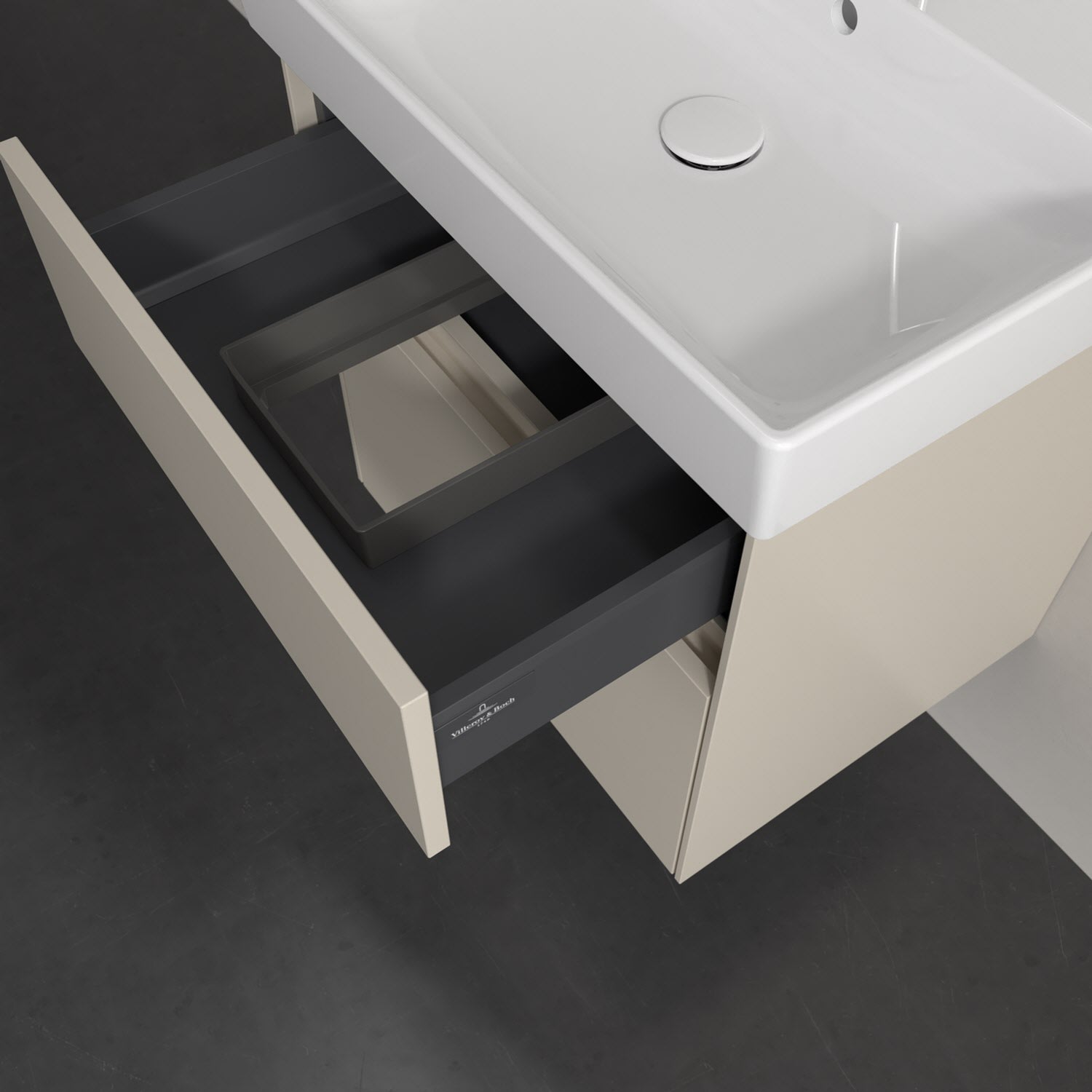 Kompaktes Design und feine Linien: Der Villeroy & Boch Waschbeckenunterschrank aus der Collaro Kollektion mit zwei Auszügen passt perfekt in kleine Bäder oder Gästebäder. Eine Griffleiste mit integrierter, stufenlos einstellbarer LED-Beleuchtung sorgt für eine schlichte, stimmungsvolle Front. Steuern lässt sich das Licht über einen Touch-Sensor seitlich am Unterschrank. Im Inneren bietet das Möbelstück erstaunlich viel Komfort – ermöglicht durch großzügigen Stauraum und den integrierten Antirutschboden. Die mitgelieferte Accessory Box bietet kleinen Badutensilien oder Kosmetik Platz und sorgt so für den nötigen Überblick. Dank SoftClosing und Selbsteinzug lassen sich die Auszüge nach der Nutzung lautlos schließen. Die Front ist mit einer hochwertigen Lackierung versehen, deren Anti-Fingerprint-Oberfläche unschönen Fingerabdrücken vorbeugt.