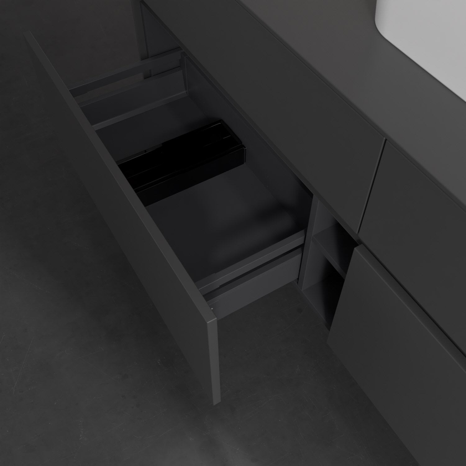Stauraumwunder im zeitgemäßen Design: Der Villeroy & Boch Waschbeckenunterschrank aus der Collaro Kollektion eignet sich besonders für Familienbäder und bietet genau den Platz, der dort benötigt wird. Eine integrierte Griffleiste sorgt für eine schlichte, moderne Front. Steuern lässt sich das Licht über einen Touch-Sensor seitlich am Unterschrank. Im Inneren bietet das Möbelstück mit vier Auszügen erstaunlich viel Komfort – ermöglicht durch großzügiges Platzangebot und den integrierten Antirutschboden. Variabel setzbare Glasabtrennungen und mitgelieferte Accessory Boxen sorgen für den nötigen Überblick. Dank SoftClosing und Selbsteinzug lassen sich die Auszüge nach der Nutzung lautlos schließen. Die Front ist mit einer hochwertigen Lackierung versehen, deren Anti-Fingerprint-Oberfläche unschönen Fingerabdrücken vorbeugt.