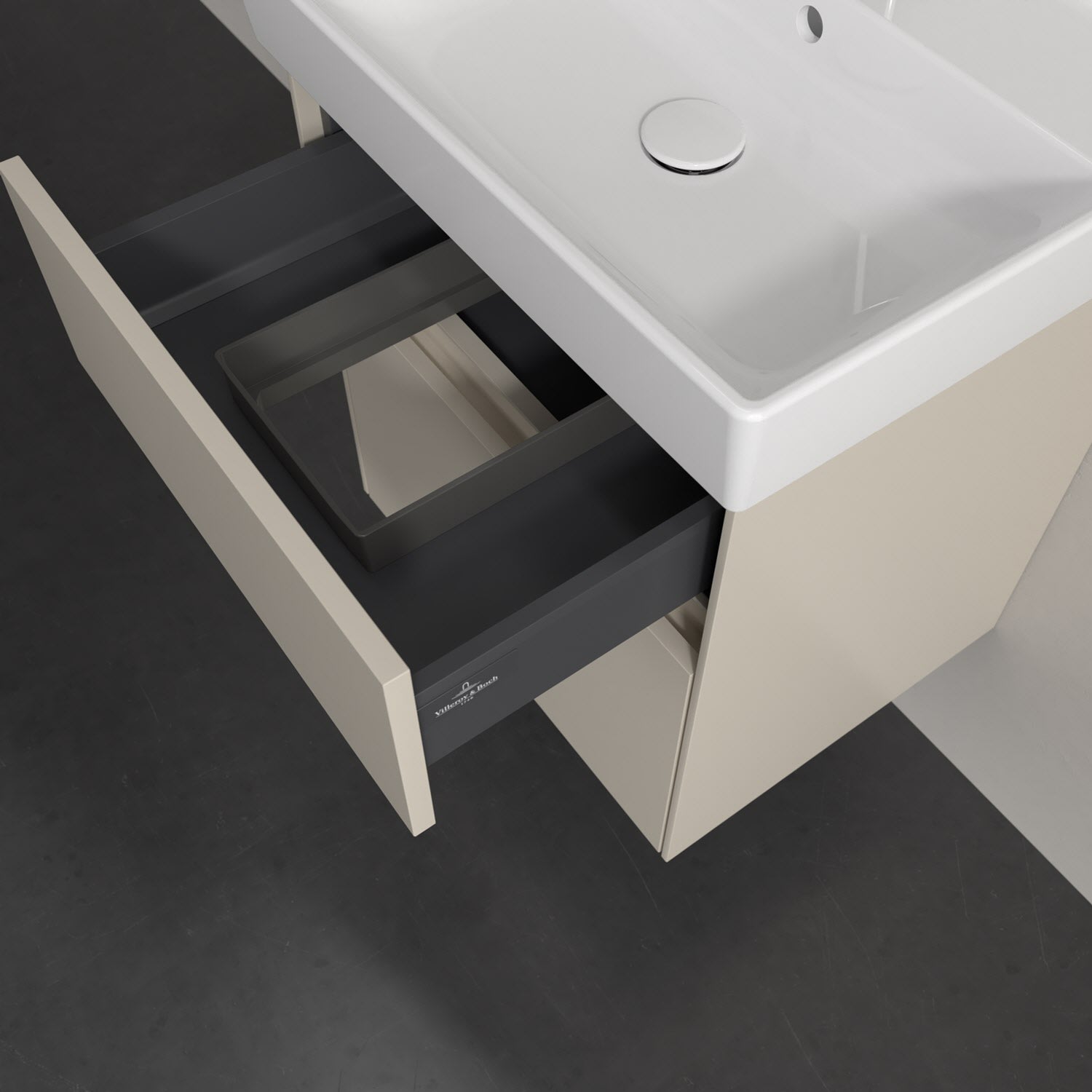 Kompaktes Design und feine Linien: Der Villeroy & Boch Waschbeckenunterschrank aus der Collaro Kollektion mit zwei Auszügen passt perfekt in kleine Bäder oder Gästebäder. Eine Griffleiste mit integrierter, stufenlos einstellbarer LED-Beleuchtung sorgt für eine schlichte, stimmungsvolle Front. Steuern lässt sich das Licht über einen Touch-Sensor seitlich am Unterschrank. Im Inneren bietet das Möbelstück erstaunlich viel Komfort – ermöglicht durch großzügigen Stauraum und den integrierten Antirutschboden. Die mitgelieferte Accessory Box bietet kleinen Badutensilien oder Kosmetik Platz und sorgt so für den nötigen Überblick. Dank SoftClosing und Selbsteinzug lassen sich die Auszüge nach der Nutzung lautlos schließen. Die Front ist mit einer hochwertigen Lackierung versehen, deren Anti-Fingerprint-Oberfläche unschönen Fingerabdrücken vorbeugt.