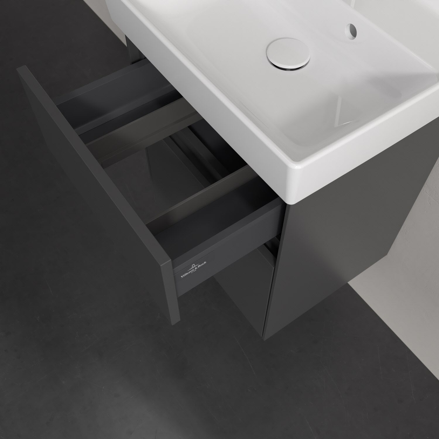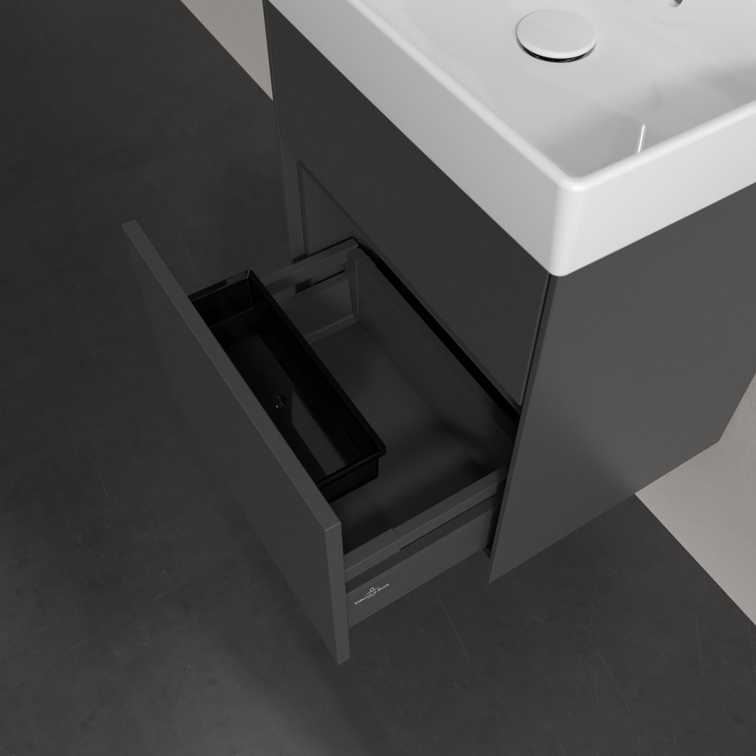 Kompaktes Design und feine Linien: Der Villeroy & Boch Waschbeckenunterschrank aus der Collaro Kollektion mit zwei Auszügen passt perfekt in kleine Bäder oder Gästebäder. Eine Griffleiste mit integrierter, stufenlos einstellbarer LED-Beleuchtung sorgt für eine schlichte, stimmungsvolle Front. Steuern lässt sich das Licht über einen Touch-Sensor seitlich am Unterschrank. Im Inneren bietet das Möbelstück erstaunlich viel Komfort – ermöglicht durch großzügigen Stauraum und den integrierten Antirutschboden. Die mitgelieferte Accessory Box bietet kleinen Badutensilien oder Kosmetik Platz und sorgt so für den nötigen Überblick. Dank SoftClosing und Selbsteinzug lassen sich die Auszüge nach der Nutzung lautlos schließen. Die Front ist mit einer hochwertigen Lackierung versehen, deren Anti-Fingerprint-Oberfläche unschönen Fingerabdrücken vorbeugt.