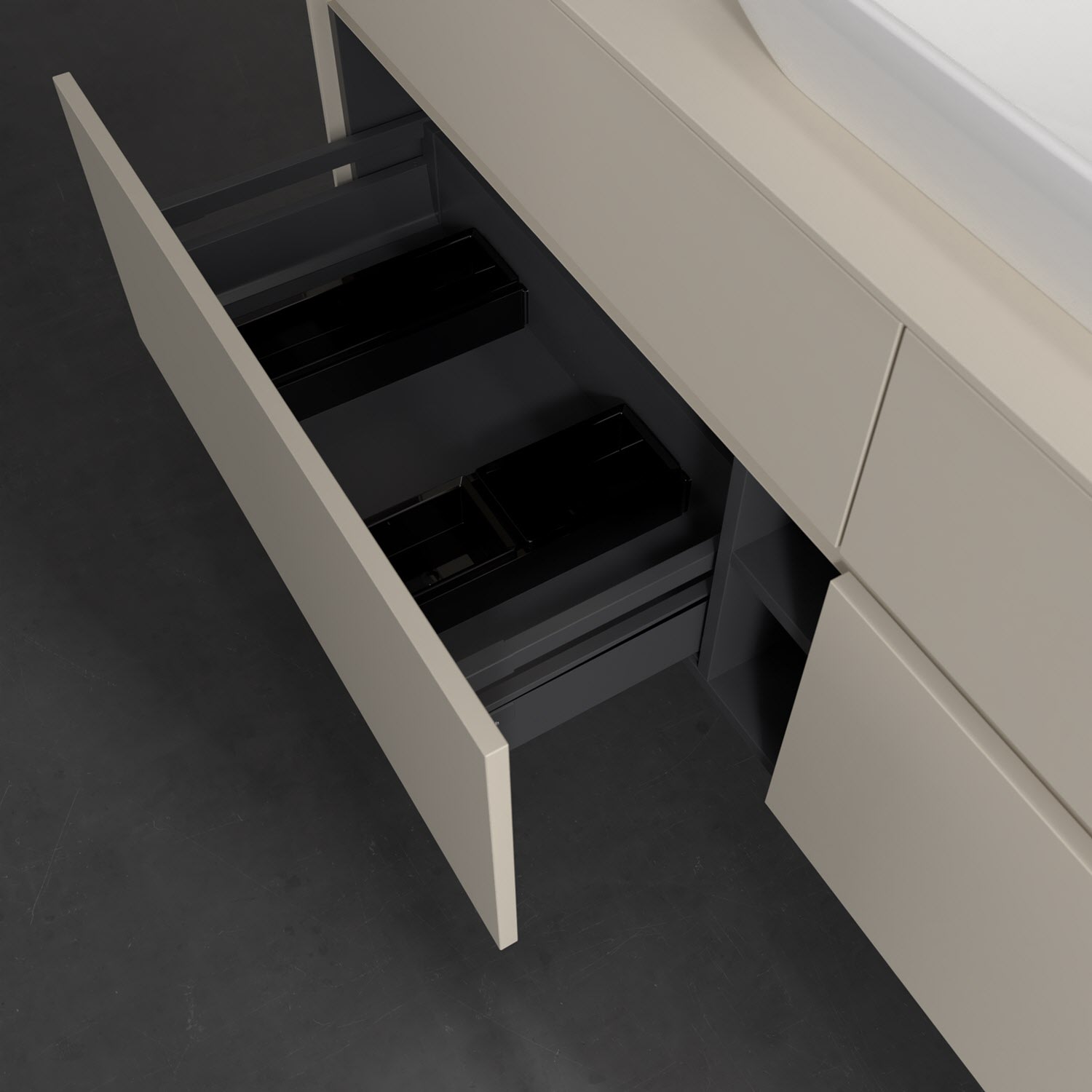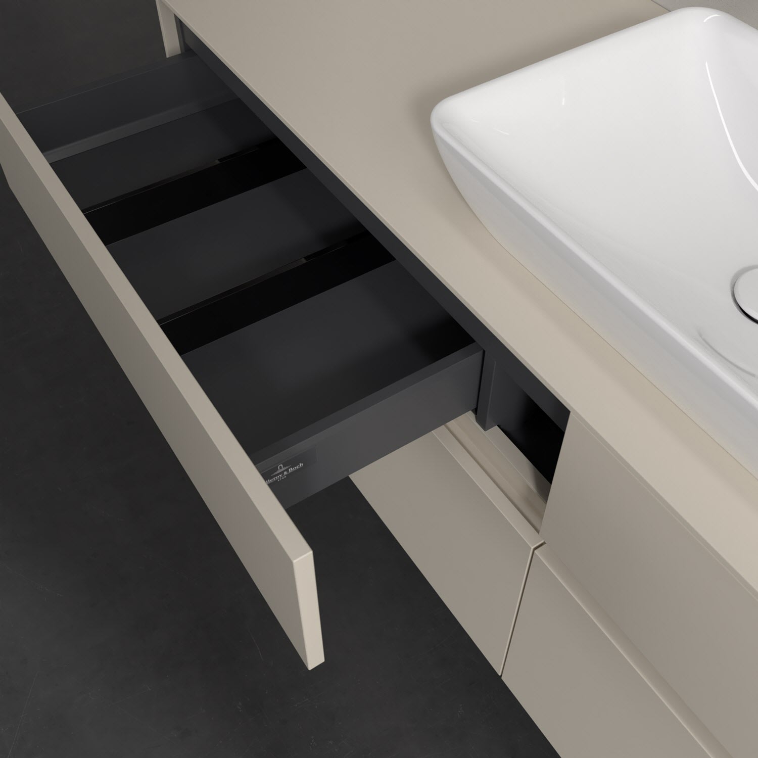 Stauraumwunder im zeitgemäßen Design: Der Villeroy & Boch Waschbeckenunterschrank aus der Collaro Kollektion eignet sich besonders für Familienbäder und bietet genau den Platz, der dort benötigt wird. Eine integrierte Griffleiste sorgt für eine schlichte, moderne Front. Steuern lässt sich das Licht über einen Touch-Sensor seitlich am Unterschrank. Im Inneren bietet das Möbelstück mit vier Auszügen erstaunlich viel Komfort – ermöglicht durch großzügiges Platzangebot und den integrierten Antirutschboden. Variabel setzbare Glasabtrennungen und mitgelieferte Accessory Boxen sorgen für den nötigen Überblick. Dank SoftClosing und Selbsteinzug lassen sich die Auszüge nach der Nutzung lautlos schließen. Die Front ist mit einer hochwertigen Lackierung versehen, deren Anti-Fingerprint-Oberfläche unschönen Fingerabdrücken vorbeugt._x