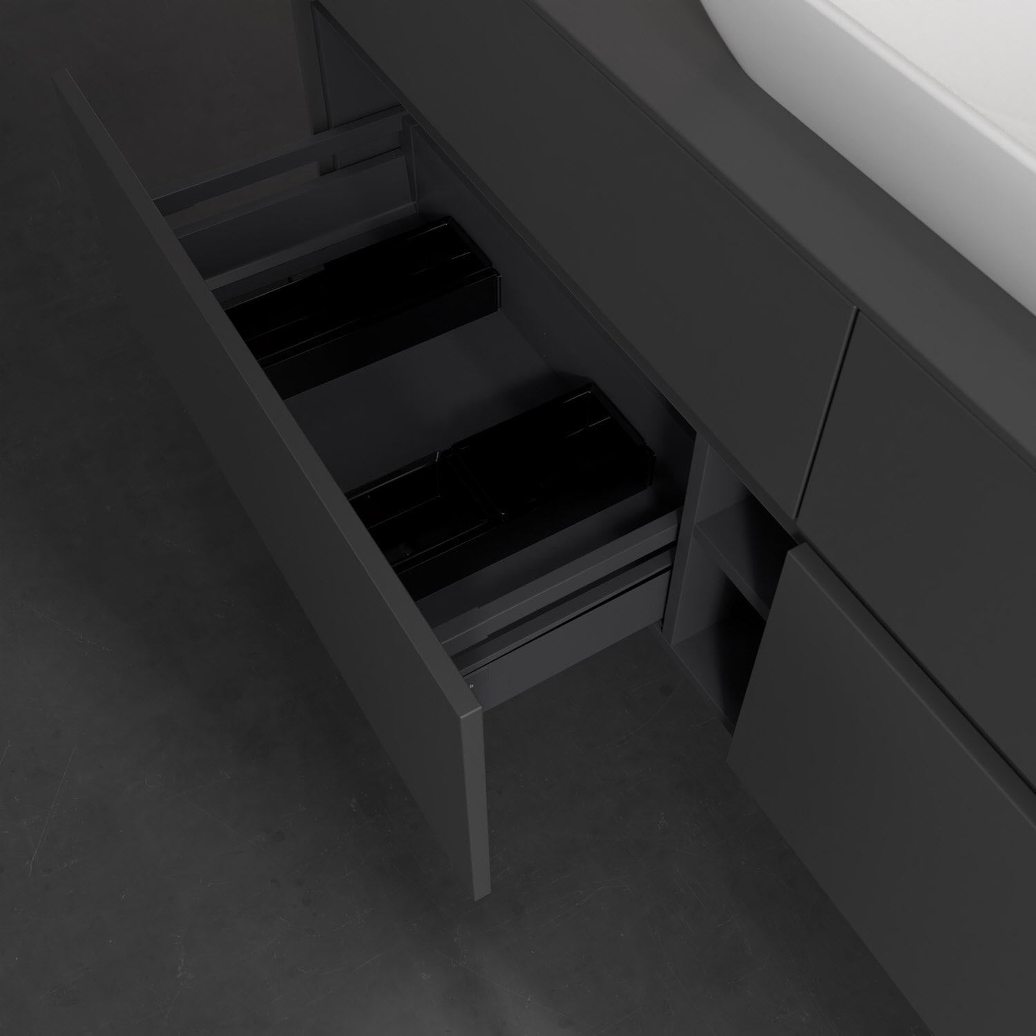 Stauraumwunder im zeitgemäßen Design: Der Villeroy & Boch Waschbeckenunterschrank aus der Collaro Kollektion eignet sich besonders für Familienbäder und bietet genau den Platz, der dort benötigt wird. Eine integrierte Griffleiste sorgt für eine schlichte, moderne Front. Steuern lässt sich das Licht über einen Touch-Sensor seitlich am Unterschrank. Im Inneren bietet das Möbelstück mit vier Auszügen erstaunlich viel Komfort – ermöglicht durch großzügiges Platzangebot und den integrierten Antirutschboden. Variabel setzbare Glasabtrennungen und mitgelieferte Accessory Boxen sorgen für den nötigen Überblick. Dank SoftClosing und Selbsteinzug lassen sich die Auszüge nach der Nutzung lautlos schließen. Die Front ist mit einer hochwertigen Lackierung versehen, deren Anti-Fingerprint-Oberfläche unschönen Fingerabdrücken vorbeugt.