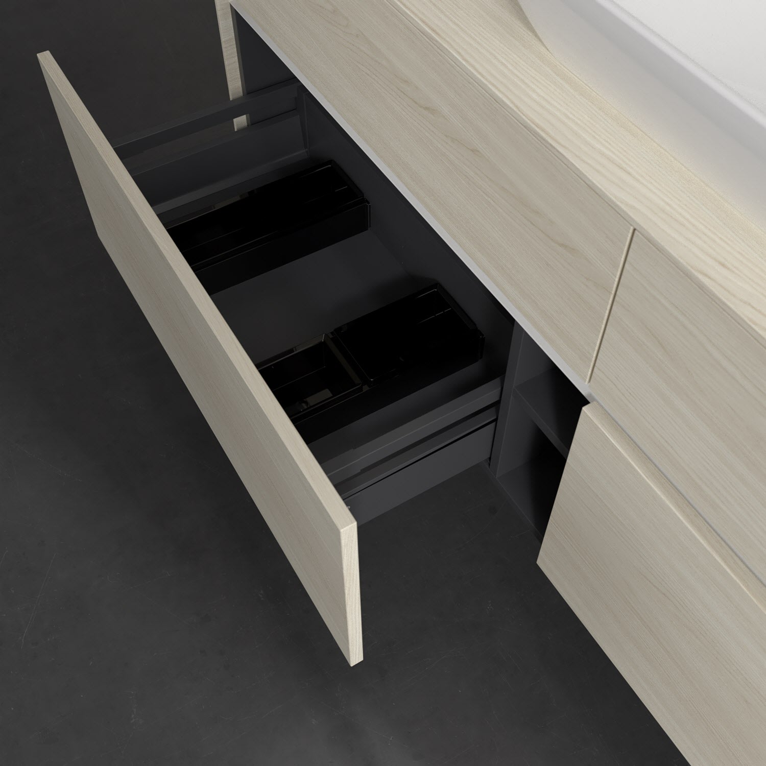 Stauraumwunder im zeitgemäßen Design: Der Villeroy & Boch Waschbeckenunterschrank aus der Collaro Kollektion eignet sich besonders für Familienbäder und bietet genau den Platz, der dort benötigt wird. Eine integrierte Griffleiste sorgt für eine schlichte, moderne Front. Steuern lässt sich das Licht über einen Touch-Sensor seitlich am Unterschrank. Im Inneren bietet das Möbelstück mit vier Auszügen erstaunlich viel Komfort – ermöglicht durch großzügiges Platzangebot und den integrierten Antirutschboden. Variabel setzbare Glasabtrennungen und mitgelieferte Accessory Boxen sorgen für den nötigen Überblick. Dank SoftClosing und Selbsteinzug lassen sich die Auszüge nach der Nutzung lautlos schließen. Für eine besonders leichte Reinigung sorgt die pflegeleichte Direktbeschichtung.