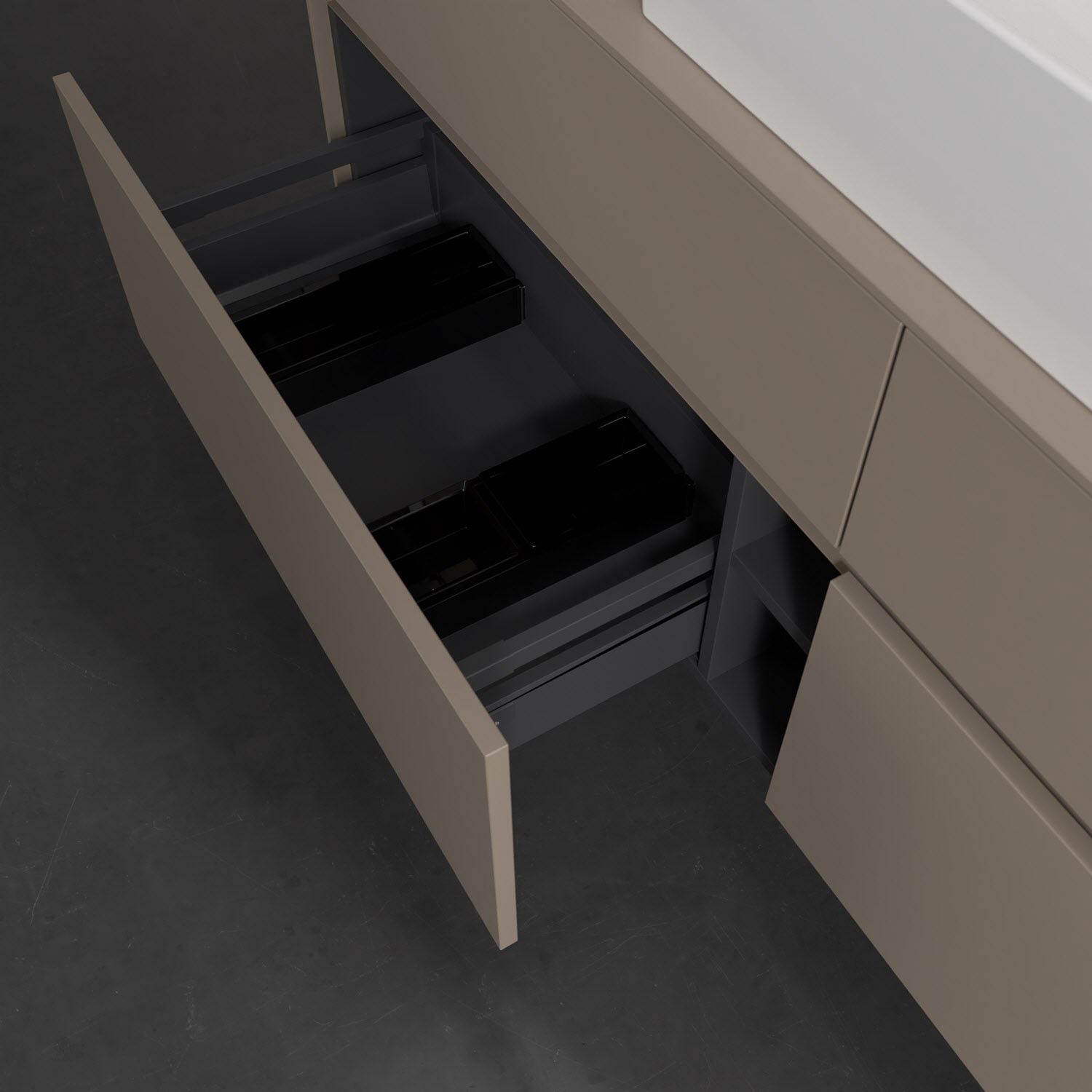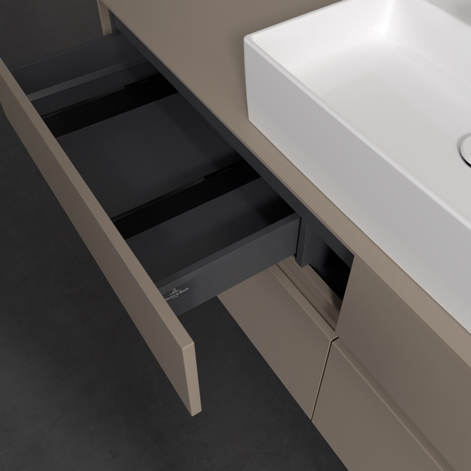 Stauraumwunder im zeitgemäßen Design: Der Villeroy & Boch Waschbeckenunterschrank aus der Collaro Kollektion eignet sich besonders für Familienbäder und bietet genau den Platz, der dort benötigt wird. Eine integrierte Griffleiste sorgt für eine schlichte, moderne Front. Steuern lässt sich das Licht über einen Touch-Sensor seitlich am Unterschrank. Im Inneren bietet das Möbelstück mit vier Auszügen erstaunlich viel Komfort – ermöglicht durch großzügiges Platzangebot und den integrierten Antirutschboden. Variabel setzbare Glasabtrennungen und mitgelieferte Accessory Boxen sorgen für den nötigen Überblick. Dank SoftClosing und Selbsteinzug lassen sich die Auszüge nach der Nutzung lautlos schließen. Die Front ist mit einer hochwertigen Lackierung versehen, deren Anti-Fingerprint-Oberfläche unschönen Fingerabdrücken vorbeugt.