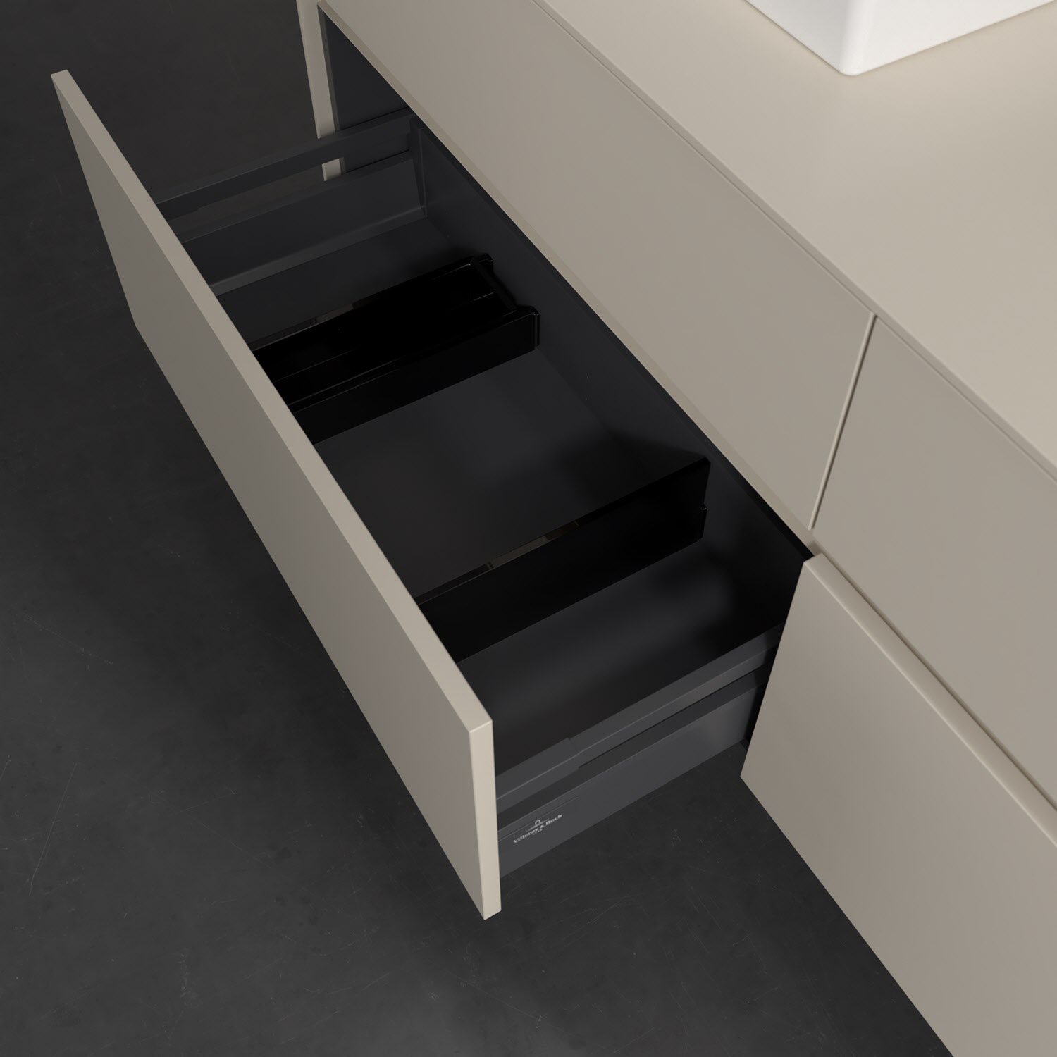 - kein Umfallen oder Verrutschen von Pflegeprodukten in den Schubladen dank rutschhemmendem Boden