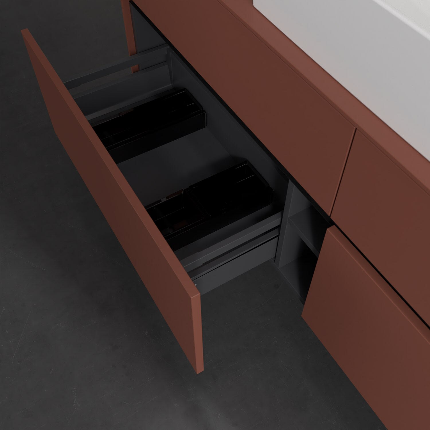 Stauraumwunder im zeitgemäßen Design: Der Villeroy & Boch Waschbeckenunterschrank aus der Collaro Kollektion eignet sich besonders für Familienbäder und bietet genau den Platz, der dort benötigt wird. Eine integrierte Griffleiste sorgt für eine schlichte, moderne Front. Steuern lässt sich das Licht über einen Touch-Sensor seitlich am Unterschrank. Im Inneren bietet das Möbelstück mit vier Auszügen erstaunlich viel Komfort – ermöglicht durch großzügiges Platzangebot und den integrierten Antirutschboden. Variabel setzbare Glasabtrennungen und mitgelieferte Accessory Boxen sorgen für den nötigen Überblick. Dank SoftClosing und Selbsteinzug lassen sich die Auszüge nach der Nutzung lautlos schließen. Die Front ist mit einer hochwertigen Lackierung versehen, deren Anti-Fingerprint-Oberfläche unschönen Fingerabdrücken vorbeugt.