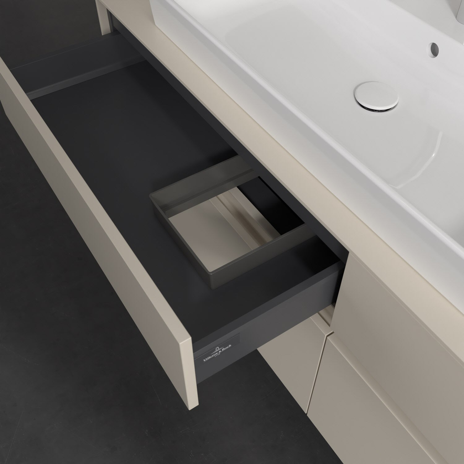 Stauraumwunder im zeitgemäßen Design: Der Villeroy & Boch Waschbeckenunterschrank aus der Collaro Kollektion eignet sich besonders für Familienbäder und bietet genau den Platz, der dort benötigt wird. Eine integrierte Griffleiste sorgt für eine schlichte, moderne Front. Im Inneren bietet das Möbelstück mit vier Auszügen erstaunlich viel Komfort – ermöglicht durch großzügiges Platzangebot und den integrierten Antirutschboden. Variabel setzbare Glasabtrennungen und mitgelieferte Accessory Boxen sorgen für den nötigen Überblick. Dank SoftClosing und Selbsteinzug lassen sich die Auszüge nach der Nutzung lautlos schließen. Die Front ist mit einer hochwertigen Lackierung versehen, deren Anti-Fingerprint-Oberfläche unschönen Fingerabdrücken vorbeugt.