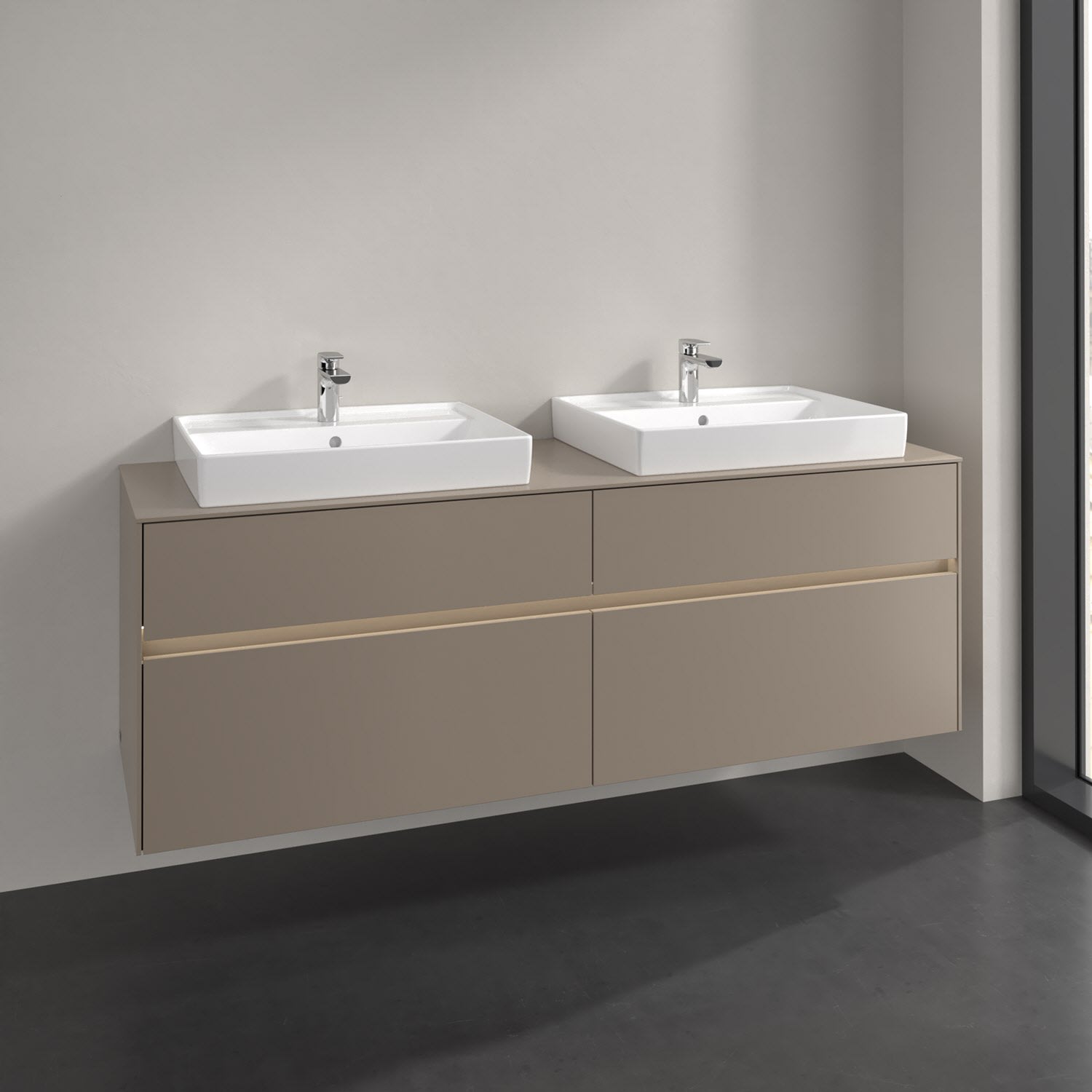 Stauraumwunder im zeitgemäßen Design: Der Villeroy & Boch Waschbeckenunterschrank aus der Collaro Kollektion eignet sich besonders für Familienbäder und bietet genau den Platz, der dort benötigt wird. Stimmungsvolles Highlight der schlichten, modernen Front ist die integrierte Griffmulde mit stufenlos einstellbarer LED-Beleuchtung. Steuern lässt sie sich über einen Touch-Sensor seitlich am Unterschrank. Im Inneren bietet das Möbelstück mit vier Auszügen erstaunlich viel Komfort – ermöglicht durch großzügiges Platzangebot und den integrierten Antirutschboden. Variabel setzbare Glasabtrennungen und mitgelieferte Accessory Boxen sorgen für den nötigen Überblick. Dank SoftClosing und Selbsteinzug lassen sich die Auszüge nach der Nutzung lautlos schließen. Die Front ist mit einer hochwertigen Lackierung versehen, deren Anti-Fingerprint-Oberfläche unschönen Fingerabdrücken vorbeugt.