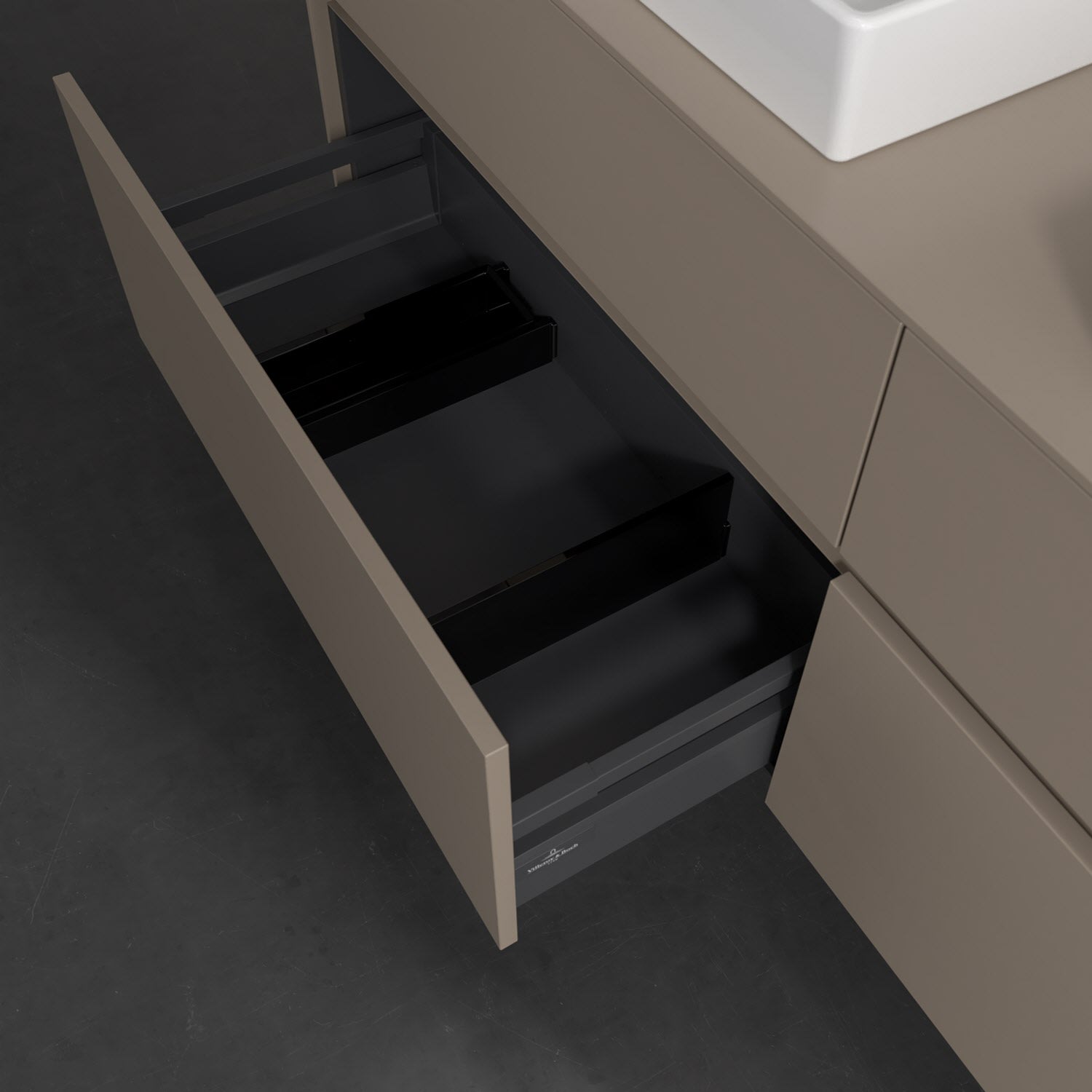 - kein Umfallen oder Verrutschen von Pflegeprodukten in den Schubladen dank rutschhemmendem Boden