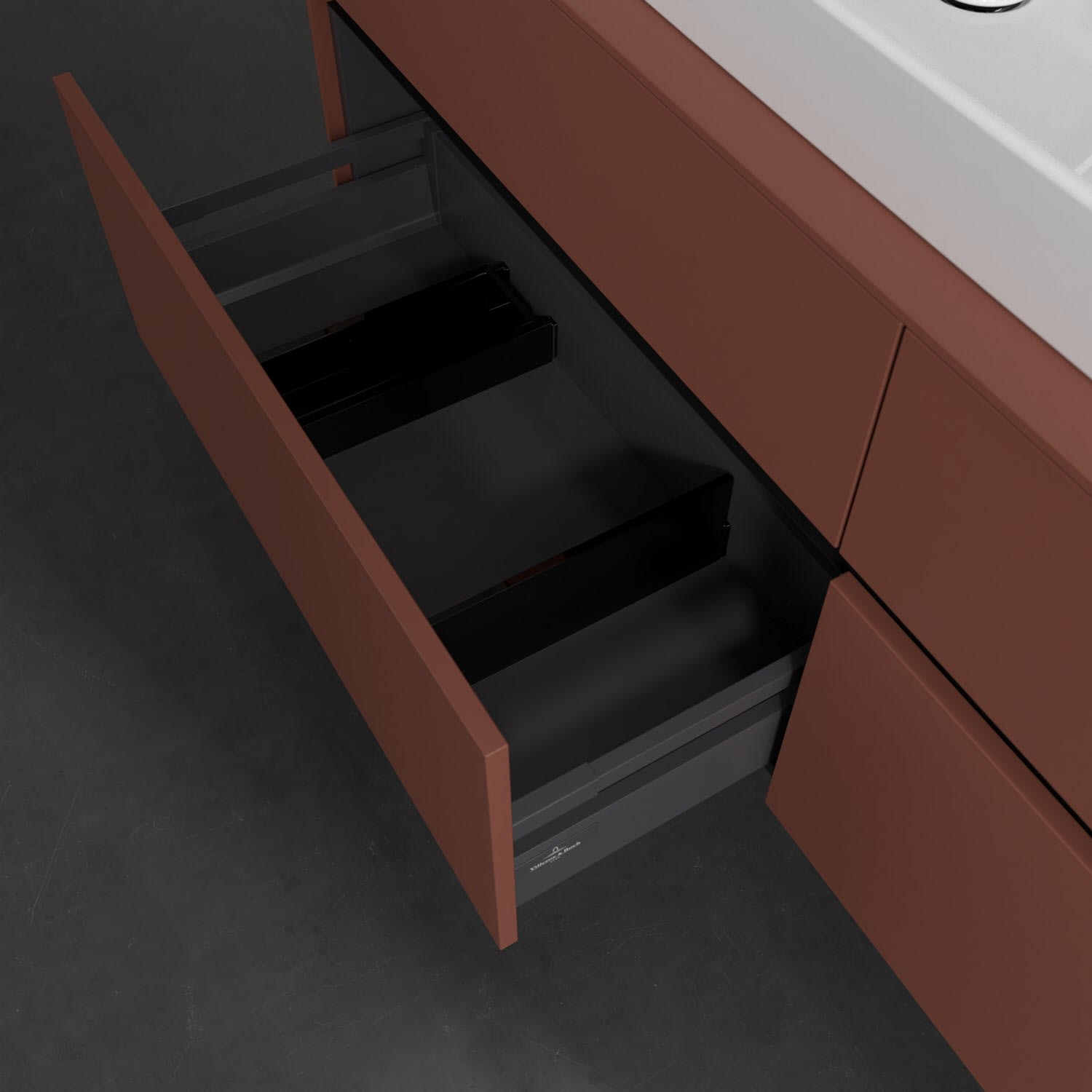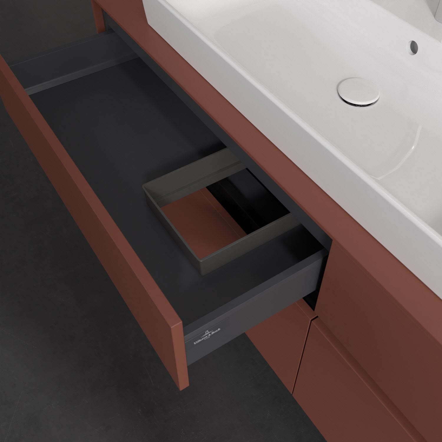Stauraumwunder im zeitgemäßen Design: Der Villeroy & Boch Waschbeckenunterschrank aus der Collaro Kollektion eignet sich besonders für Familienbäder und bietet genau den Platz, der dort benötigt wird. Eine integrierte Griffleiste sorgt für eine schlichte, moderne Front. Im Inneren bietet das Möbelstück mit vier Auszügen erstaunlich viel Komfort – ermöglicht durch großzügiges Platzangebot und den integrierten Antirutschboden. Variabel setzbare Glasabtrennungen und mitgelieferte Accessory Boxen sorgen für den nötigen Überblick. Dank SoftClosing und Selbsteinzug lassen sich die Auszüge nach der Nutzung lautlos schließen. Die Front ist mit einer hochwertigen Lackierung versehen, deren Anti-Fingerprint-Oberfläche unschönen Fingerabdrücken vorbeugt.