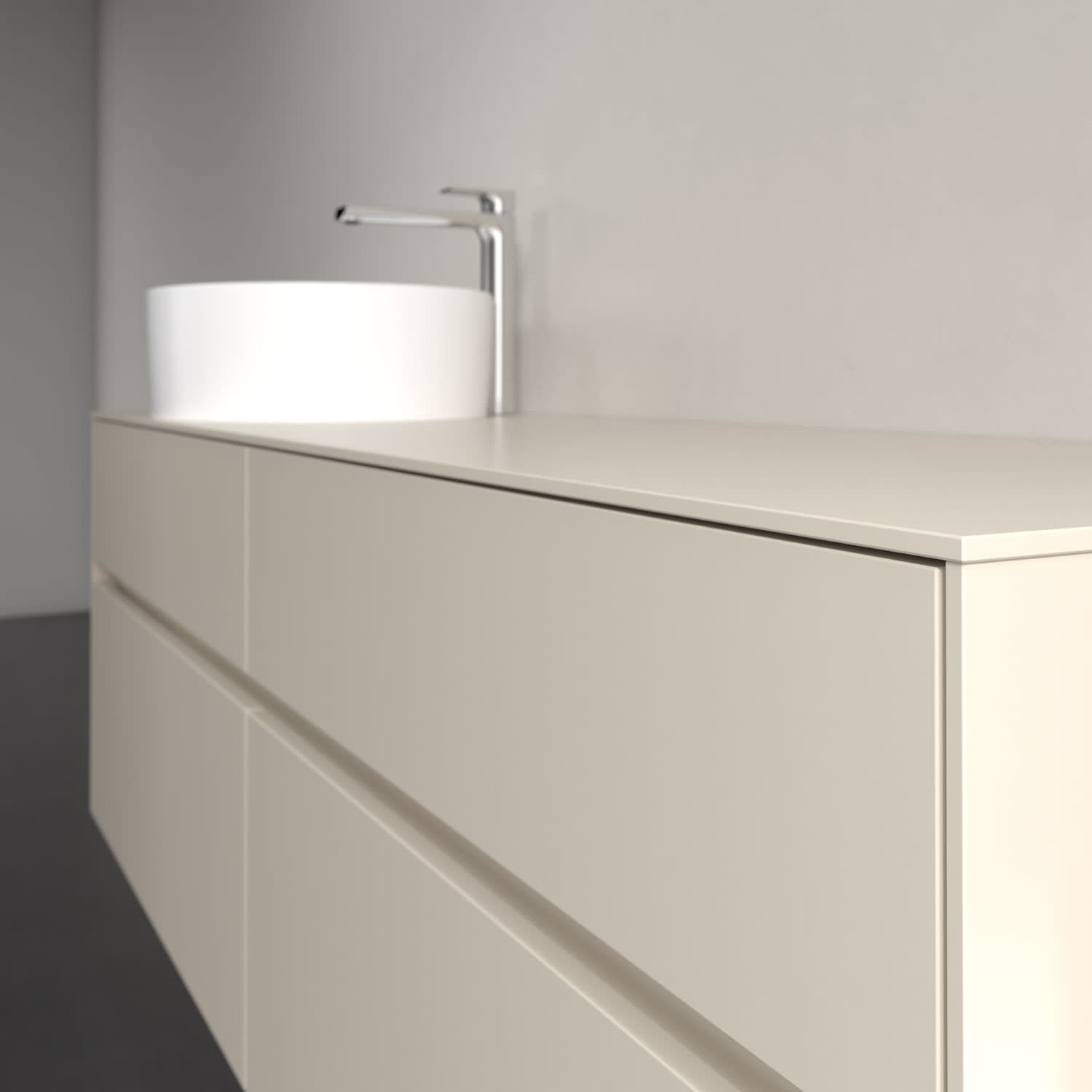 Stauraumwunder im zeitgemäßen Design: Der Villeroy & Boch Waschbeckenunterschrank aus der Collaro Kollektion eignet sich besonders für Familienbäder und bietet genau den Platz, der dort benötigt wird. Stimmungsvolles Highlight der schlichten, modernen Front ist die integrierte Griffmulde mit stufenlos einstellbarer LED-Beleuchtung. Steuern lässt sie sich über einen Touch-Sensor seitlich am Unterschrank. Im Inneren bietet das Möbelstück mit vier Auszügen erstaunlich viel Komfort – ermöglicht durch großzügiges Platzangebot und den integrierten Antirutschboden. Variabel setzbare Glasabtrennungen und mitgelieferte Accessory Boxen sorgen für den nötigen Überblick. Dank SoftClosing und Selbsteinzug lassen sich die Auszüge nach der Nutzung lautlos schließen. Die Front ist mit einer hochwertigen Lackierung versehen, deren Anti-Fingerprint-Oberfläche unschönen Fingerabdrücken vorbeugt.