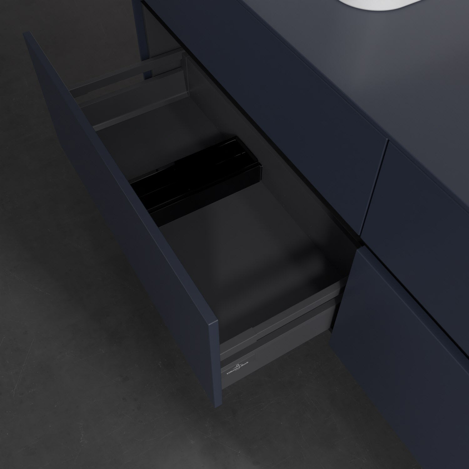 Stauraumwunder im zeitgemäßen Design: Der Villeroy & Boch Waschbeckenunterschrank aus der Collaro Kollektion eignet sich besonders für Familienbäder und bietet genau den Platz, der dort benötigt wird. Stimmungsvolles Highlight der schlichten, modernen Front ist die integrierte Griffmulde mit stufenlos einstellbarer LED-Beleuchtung. Im Inneren bietet das Möbelstück mit vier Auszügen erstaunlich viel Komfort – ermöglicht durch großzügiges Platzangebot und den integrierten Antirutschboden. Variabel setzbare Glasabtrennungen und mitgelieferte Accessory Boxen sorgen für den nötigen Überblick. Dank SoftClosing und Selbsteinzug lassen sich die Auszüge nach der Nutzung lautlos schließen. Die Front ist mit einer hochwertigen Lackierung versehen, deren Anti-Fingerprint-Oberfläche unschönen Fingerabdrücken vorbeugt.