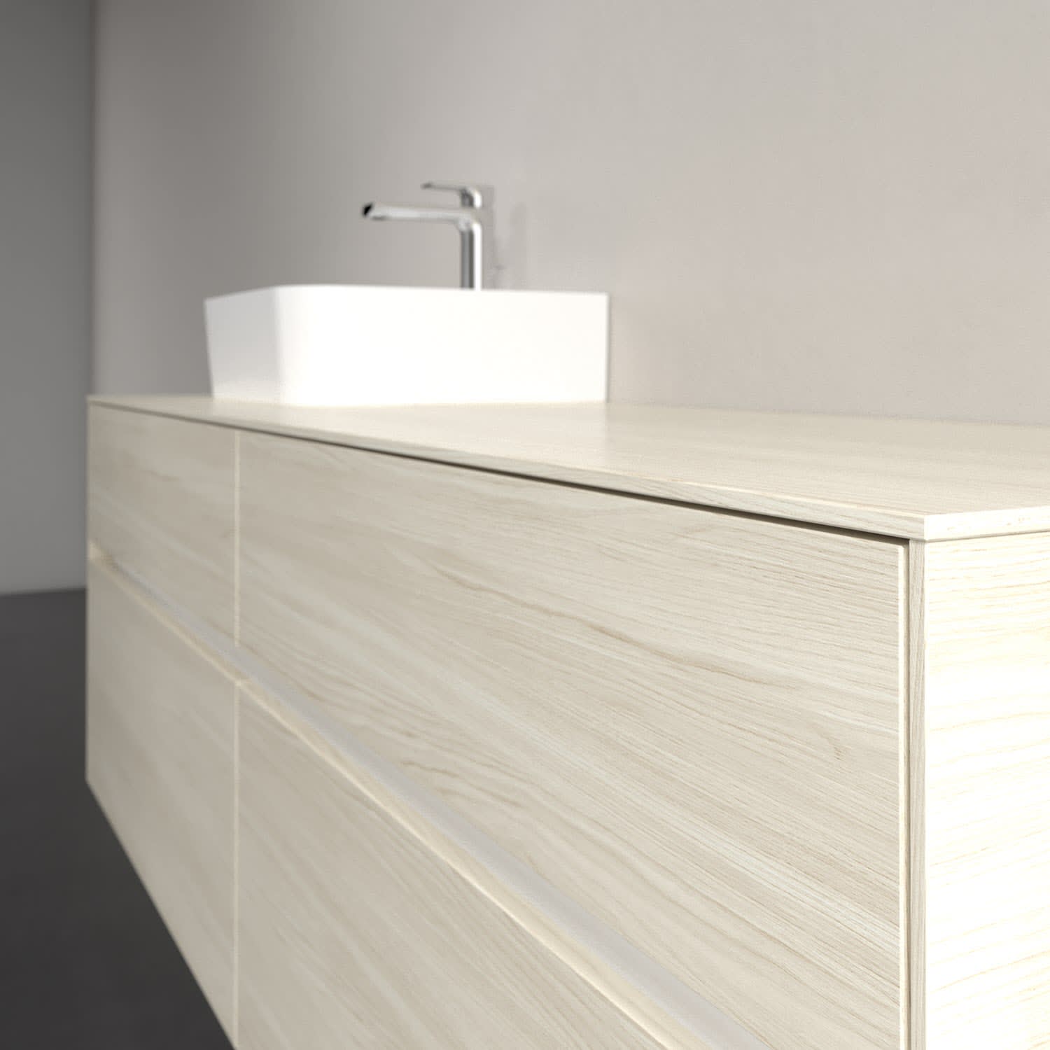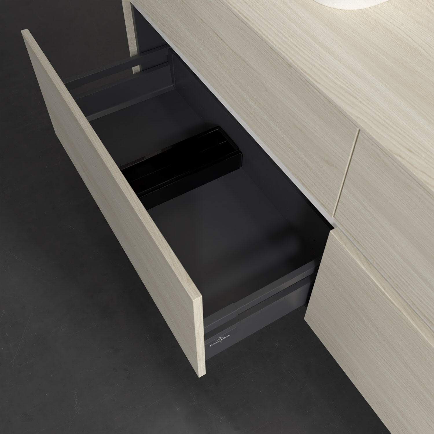 Stauraumwunder im zeitgemäßen Design: Der Villeroy & Boch Waschbeckenunterschrank aus der Collaro Kollektion eignet sich besonders für Familienbäder und bietet genau den Platz, der dort benötigt wird. Stimmungsvolles Highlight der schlichten, modernen Front ist die integrierte Griffmulde mit stufenlos einstellbarer LED-Beleuchtung. Im Inneren bietet das Möbelstück mit vier Auszügen erstaunlich viel Komfort – ermöglicht durch großzügiges Platzangebot und den integrierten Antirutschboden. Variabel setzbare Glasabtrennungen und mitgelieferte Accessory Boxen sorgen für den nötigen Überblick. Dank SoftClosing und Selbsteinzug lassen sich die Auszüge nach der Nutzung lautlos schließen. Für eine besonders leichte Reinigung sorgt die pflegeleichte Direktbeschichtung.