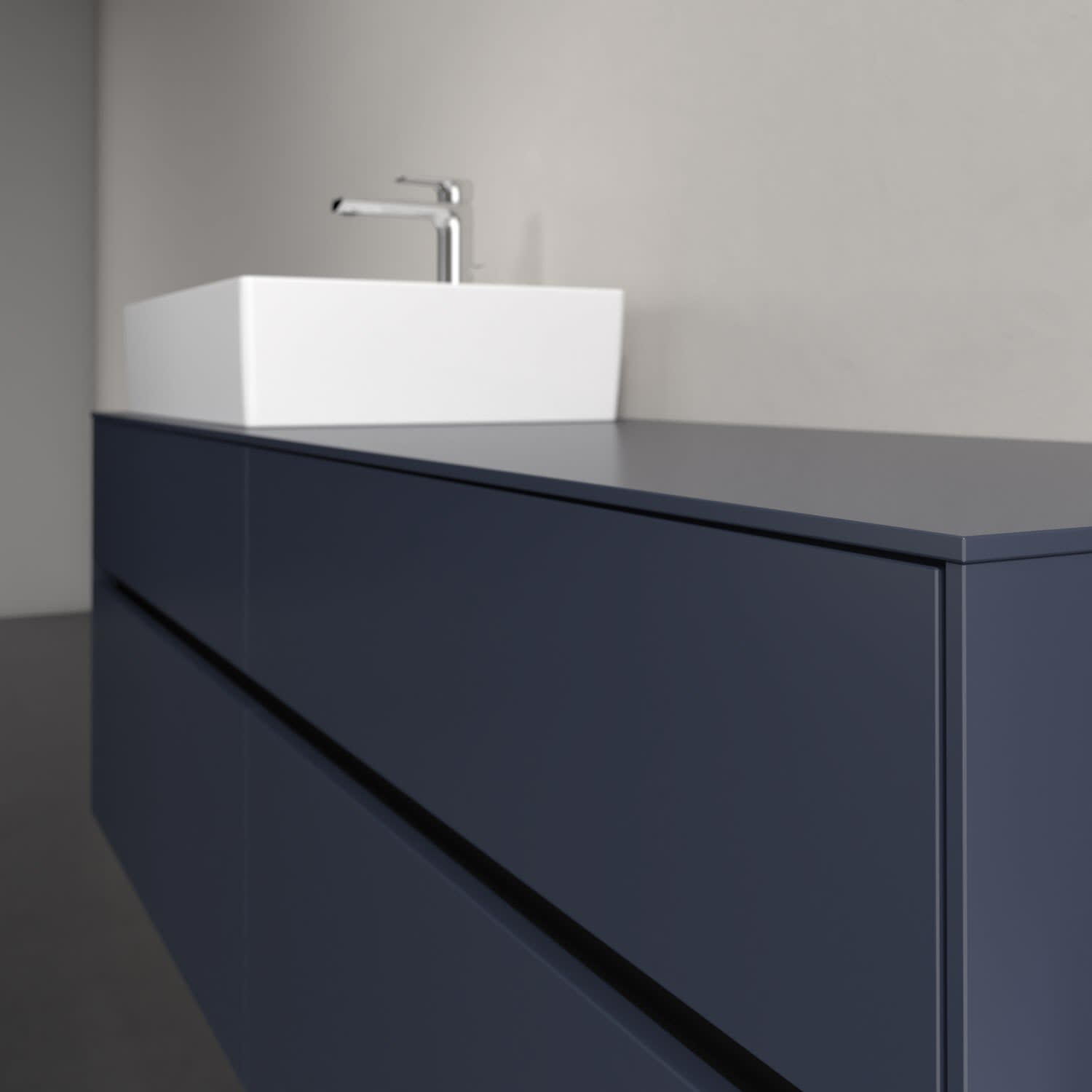 Stauraumwunder im zeitgemäßen Design: Der Villeroy & Boch Waschbeckenunterschrank aus der Collaro Kollektion eignet sich besonders für Familienbäder und bietet genau den Platz, der dort benötigt wird. Stimmungsvolles Highlight der schlichten, modernen Front ist die integrierte Griffmulde mit stufenlos einstellbarer LED-Beleuchtung. Im Inneren bietet das Möbelstück mit vier Auszügen erstaunlich viel Komfort – ermöglicht durch großzügiges Platzangebot und den integrierten Antirutschboden. Variabel setzbare Glasabtrennungen und mitgelieferte Accessory Boxen sorgen für den nötigen Überblick. Dank SoftClosing und Selbsteinzug lassen sich die Auszüge nach der Nutzung lautlos schließen. Die Front ist mit einer hochwertigen Lackierung versehen, deren Anti-Fingerprint-Oberfläche unschönen Fingerabdrücken vorbeugt.