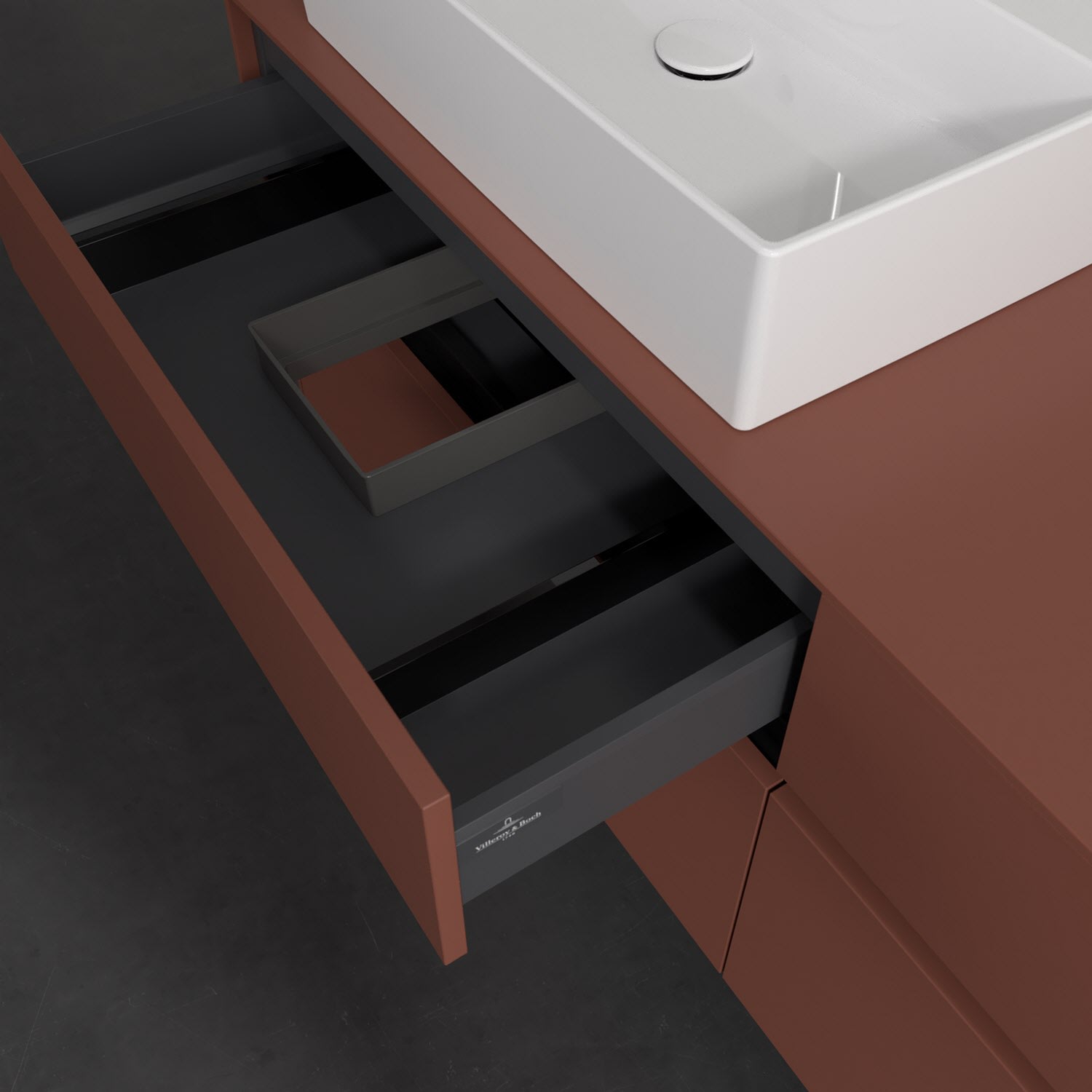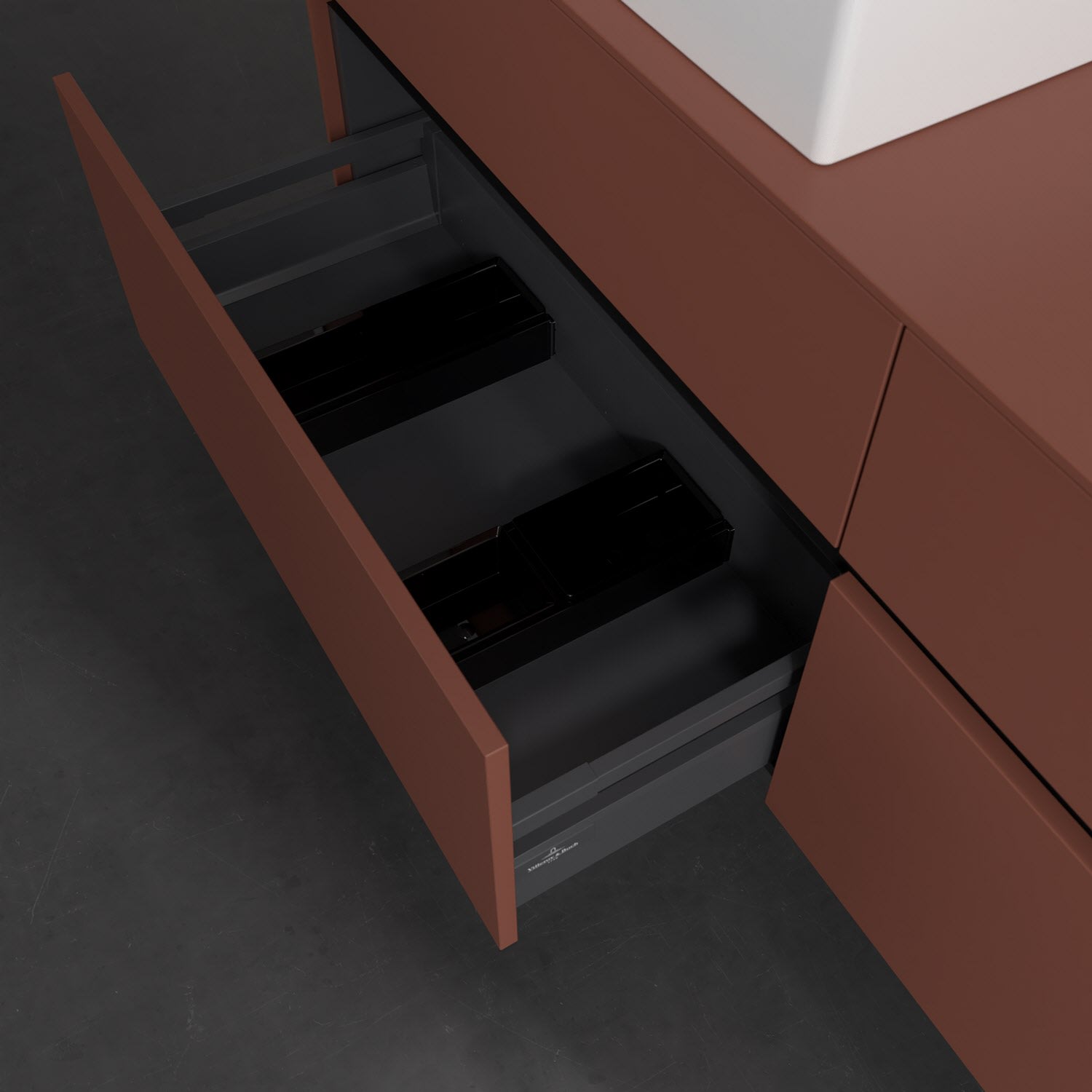 Stauraumwunder im zeitgemäßen Design: Der Villeroy & Boch Waschbeckenunterschrank aus der Collaro Kollektion eignet sich besonders für Familienbäder und bietet genau den Platz, der dort benötigt wird. Stimmungsvolles Highlight der schlichten, modernen Front ist die integrierte Griffmulde mit stufenlos einstellbarer LED-Beleuchtung. Im Inneren bietet das Möbelstück mit vier Auszügen erstaunlich viel Komfort – ermöglicht durch großzügiges Platzangebot und den integrierten Antirutschboden. Variabel setzbare Glasabtrennungen und mitgelieferte Accessory Boxen sorgen für den nötigen Überblick. Dank SoftClosing und Selbsteinzug lassen sich die Auszüge nach der Nutzung lautlos schließen. Die Front ist mit einer hochwertigen Lackierung versehen, deren Anti-Fingerprint-Oberfläche unschönen Fingerabdrücken vorbeugt.