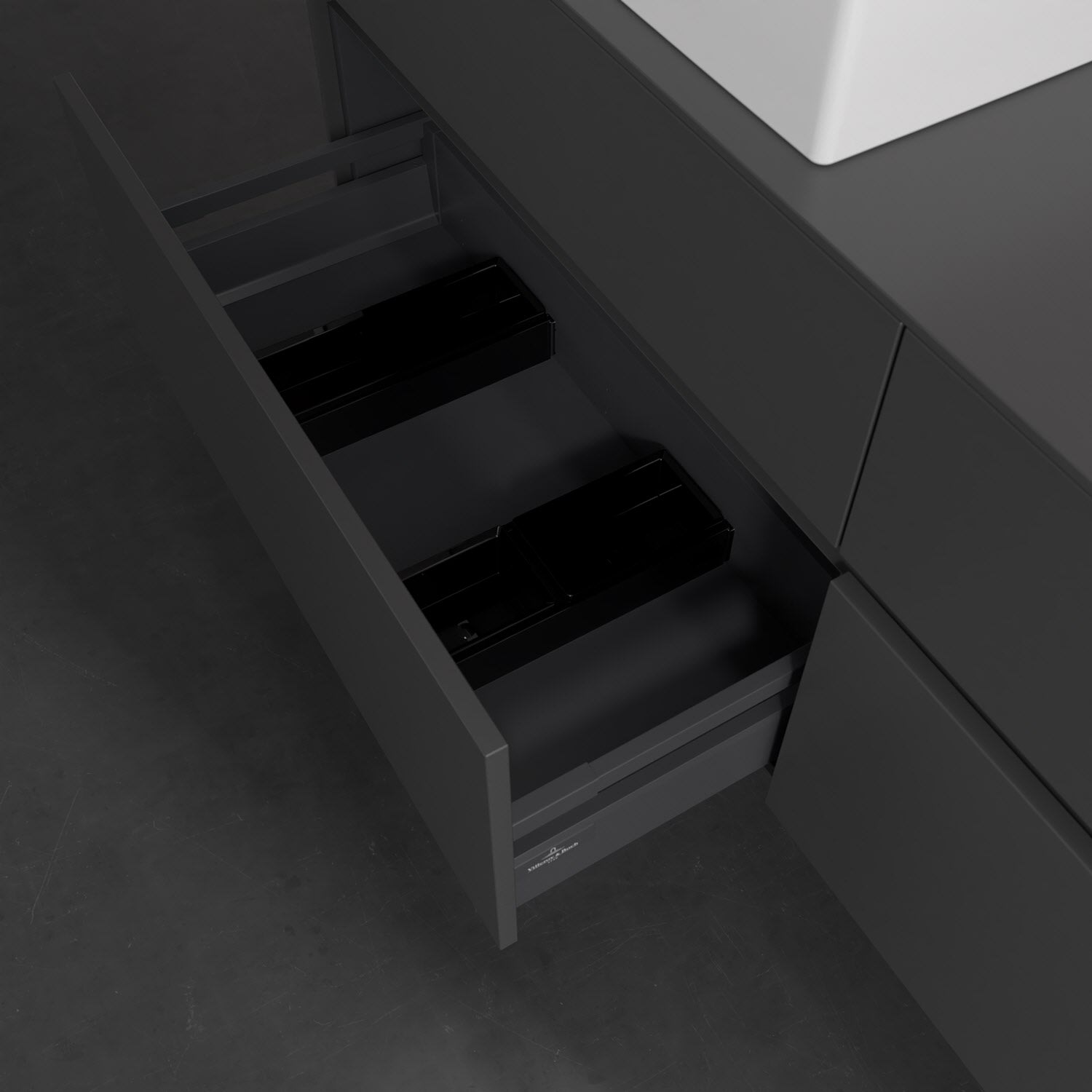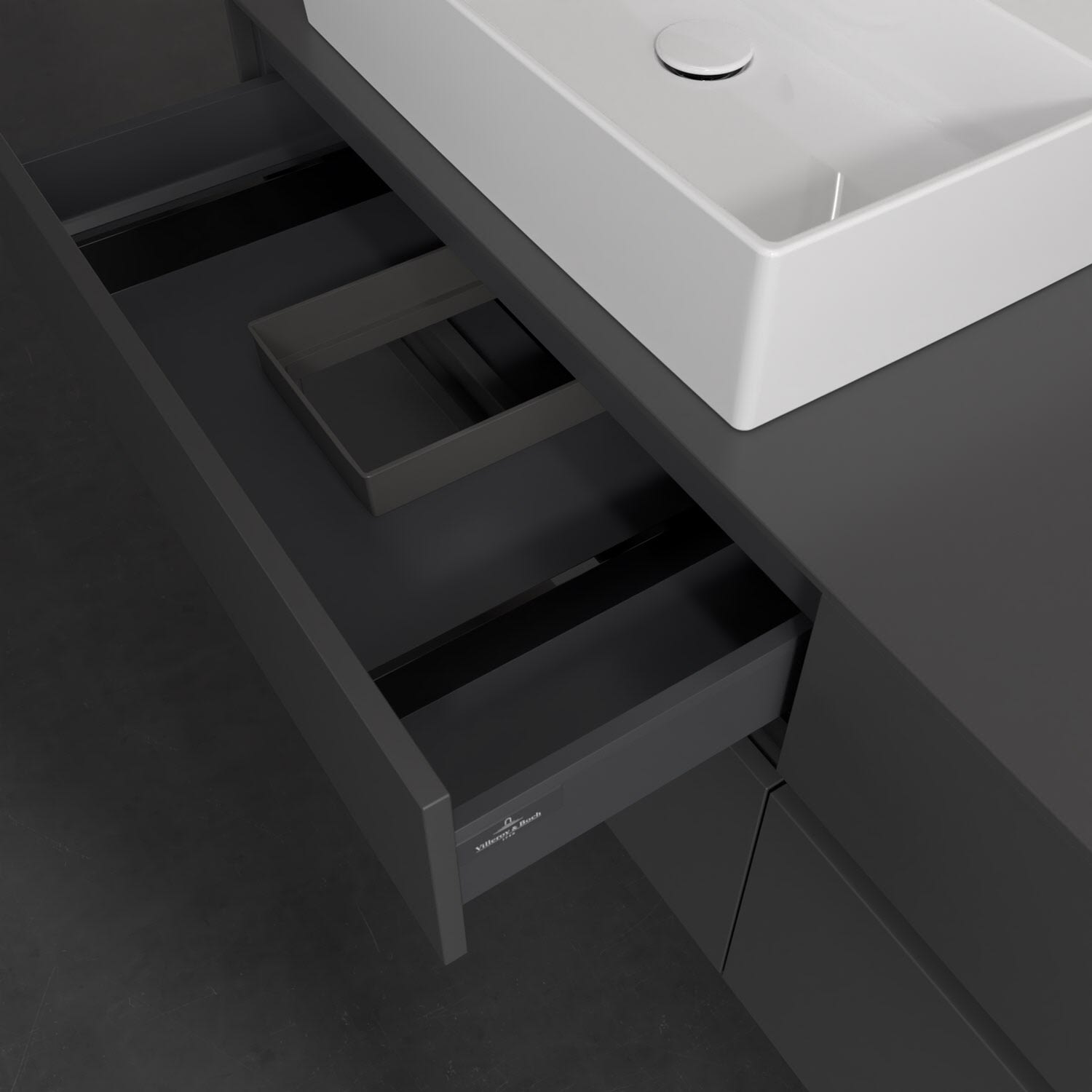 Stauraumwunder im zeitgemäßen Design: Der Villeroy & Boch Waschbeckenunterschrank aus der Collaro Kollektion eignet sich besonders für Familienbäder und bietet genau den Platz, der dort benötigt wird. Eine integrierte Griffleiste sorgt für eine schlichte, moderne Front. Steuern lässt sich das Licht über einen Touch-Sensor seitlich am Unterschrank. Im Inneren bietet das Möbelstück mit vier Auszügen erstaunlich viel Komfort – ermöglicht durch großzügiges Platzangebot und den integrierten Antirutschboden. Variabel setzbare Glasabtrennungen und mitgelieferte Accessory Boxen sorgen für den nötigen Überblick. Dank SoftClosing und Selbsteinzug lassen sich die Auszüge nach der Nutzung lautlos schließen. Die Front ist mit einer hochwertigen Lackierung versehen, deren Anti-Fingerprint-Oberfläche unschönen Fingerabdrücken vorbeugt.