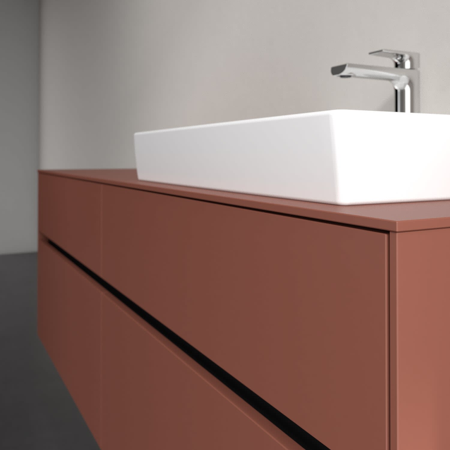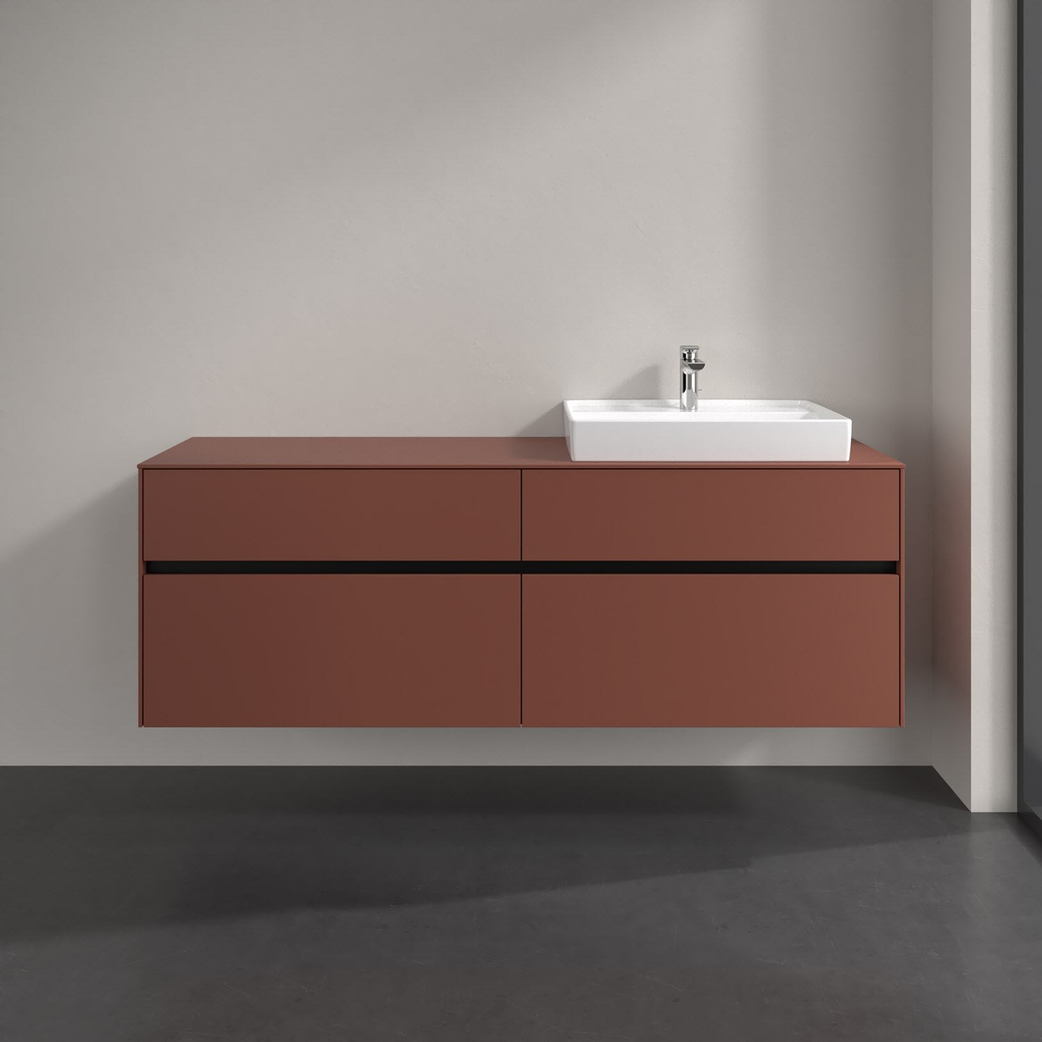 Stauraumwunder im zeitgemäßen Design: Der Villeroy & Boch Waschbeckenunterschrank aus der Collaro Kollektion eignet sich besonders für Familienbäder und bietet genau den Platz, der dort benötigt wird. Stimmungsvolles Highlight der schlichten, modernen Front ist die integrierte Griffmulde mit stufenlos einstellbarer LED-Beleuchtung. Steuern lässt sie sich über einen Touch-Sensor seitlich am Unterschrank. Im Inneren bietet das Möbelstück mit vier Auszügen erstaunlich viel Komfort – ermöglicht durch großzügiges Platzangebot und den integrierten Antirutschboden. Variabel setzbare Glasabtrennungen und mitgelieferte Accessory Boxen sorgen für den nötigen Überblick. Dank SoftClosing und Selbsteinzug lassen sich die Auszüge nach der Nutzung lautlos schließen. Die Front ist mit einer hochwertigen Lackierung versehen, deren Anti-Fingerprint-Oberfläche unschönen Fingerabdrücken vorbeugt.
