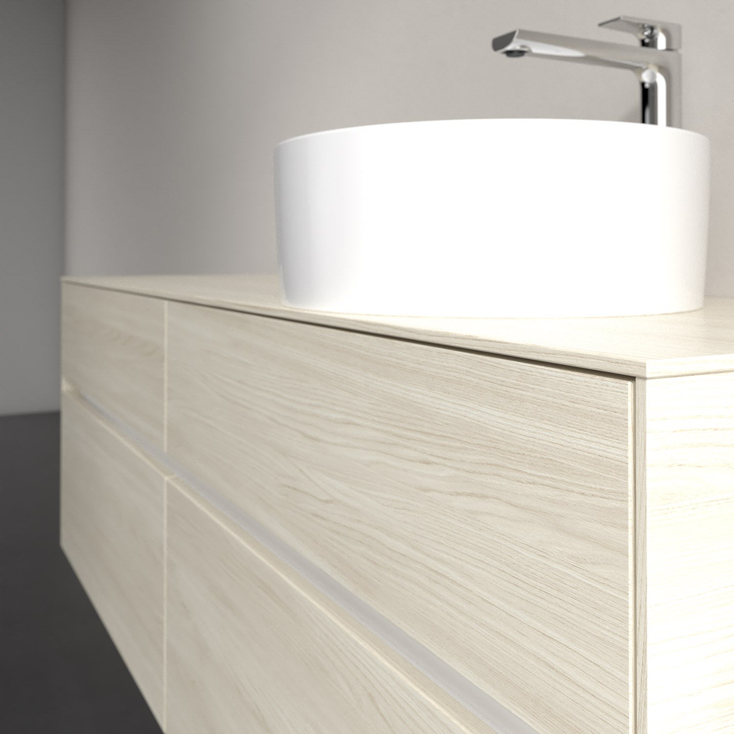 Stauraumwunder im zeitgemäßen Design: Der Villeroy & Boch Waschbeckenunterschrank aus der Collaro Kollektion eignet sich besonders für Familienbäder und bietet genau den Platz, der dort benötigt wird. Stimmungsvolles Highlight der schlichten, modernen Front ist die integrierte Griffmulde mit stufenlos einstellbarer LED-Beleuchtung. Steuern lässt sie sich über einen Touch-Sensor seitlich am Unterschrank. Im Inneren bietet das Möbelstück mit vier Auszügen erstaunlich viel Komfort – ermöglicht durch großzügiges Platzangebot und den integrierten Antirutschboden. Variabel setzbare Glasabtrennungen und mitgelieferte Accessory Boxen sorgen für den nötigen Überblick. Dank SoftClosing und Selbsteinzug lassen sich die Auszüge nach der Nutzung lautlos schließen. Für eine besonders leichte Reinigung sorgt die pflegeleichte Direktbeschichtung.