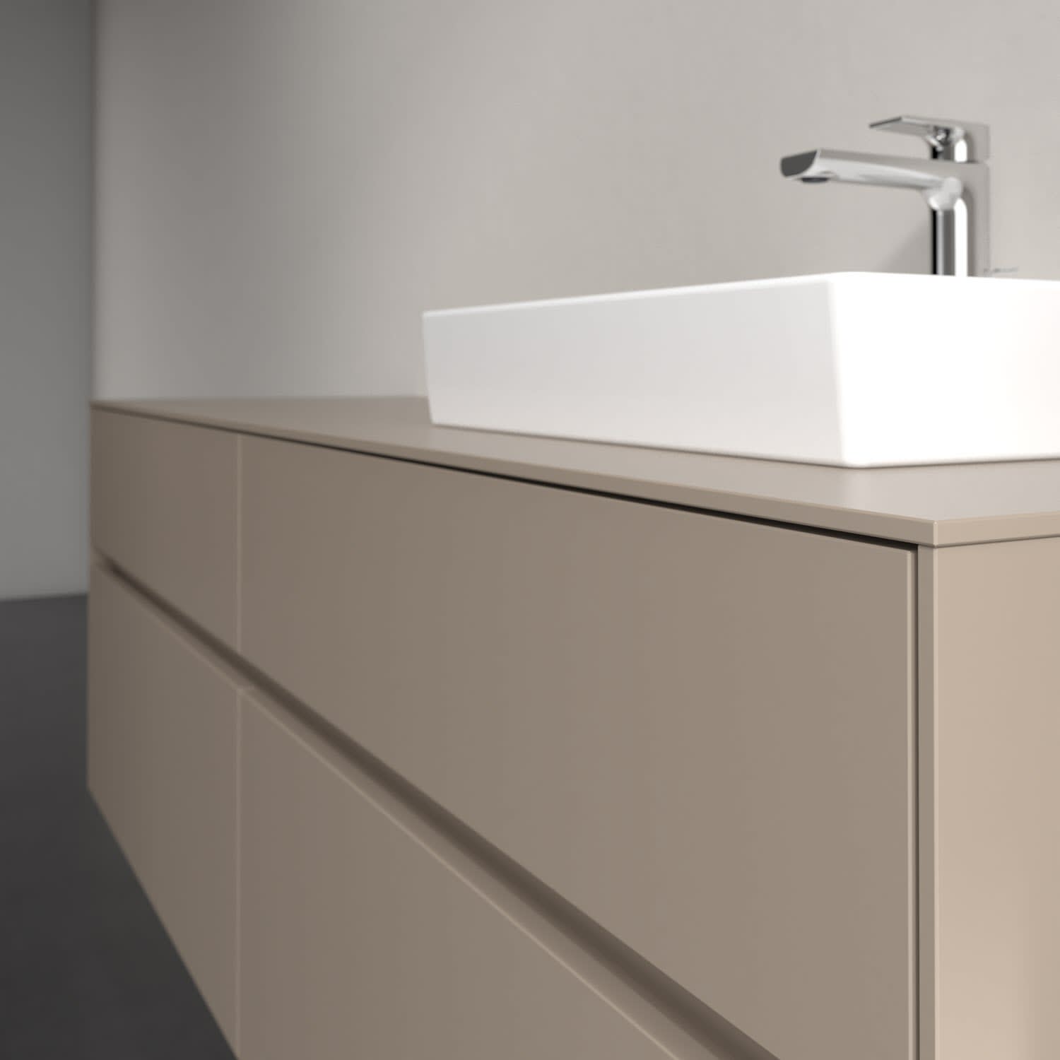 Stauraumwunder im zeitgemäßen Design: Der Villeroy & Boch Waschbeckenunterschrank aus der Collaro Kollektion eignet sich besonders für Familienbäder und bietet genau den Platz, der dort benötigt wird. Stimmungsvolles Highlight der schlichten, modernen Front ist die integrierte Griffmulde mit stufenlos einstellbarer LED-Beleuchtung. Im Inneren bietet das Möbelstück mit vier Auszügen erstaunlich viel Komfort – ermöglicht durch großzügiges Platzangebot und den integrierten Antirutschboden. Variabel setzbare Glasabtrennungen und mitgelieferte Accessory Boxen sorgen für den nötigen Überblick. Dank SoftClosing und Selbsteinzug lassen sich die Auszüge nach der Nutzung lautlos schließen. Die Front ist mit einer hochwertigen Lackierung versehen, deren Anti-Fingerprint-Oberfläche unschönen Fingerabdrücken vorbeugt.