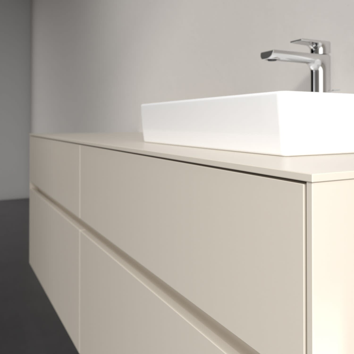 Stauraumwunder im zeitgemäßen Design: Der Villeroy & Boch Waschbeckenunterschrank aus der Collaro Kollektion eignet sich besonders für Familienbäder und bietet genau den Platz, der dort benötigt wird. Stimmungsvolles Highlight der schlichten, modernen Front ist die integrierte Griffmulde mit stufenlos einstellbarer LED-Beleuchtung. Im Inneren bietet das Möbelstück mit vier Auszügen erstaunlich viel Komfort – ermöglicht durch großzügiges Platzangebot und den integrierten Antirutschboden. Variabel setzbare Glasabtrennungen und mitgelieferte Accessory Boxen sorgen für den nötigen Überblick. Dank SoftClosing und Selbsteinzug lassen sich die Auszüge nach der Nutzung lautlos schließen. Die Front ist mit einer hochwertigen Lackierung versehen, deren Anti-Fingerprint-Oberfläche unschönen Fingerabdrücken vorbeugt.