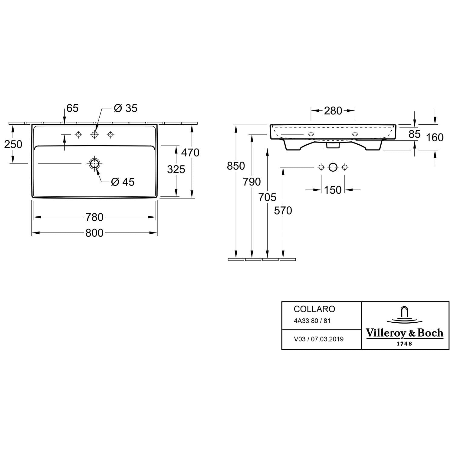Villeroy & Boch Collaro Schrankwaschtisch 80 cm mit Überlauf, 1 Hahnloch