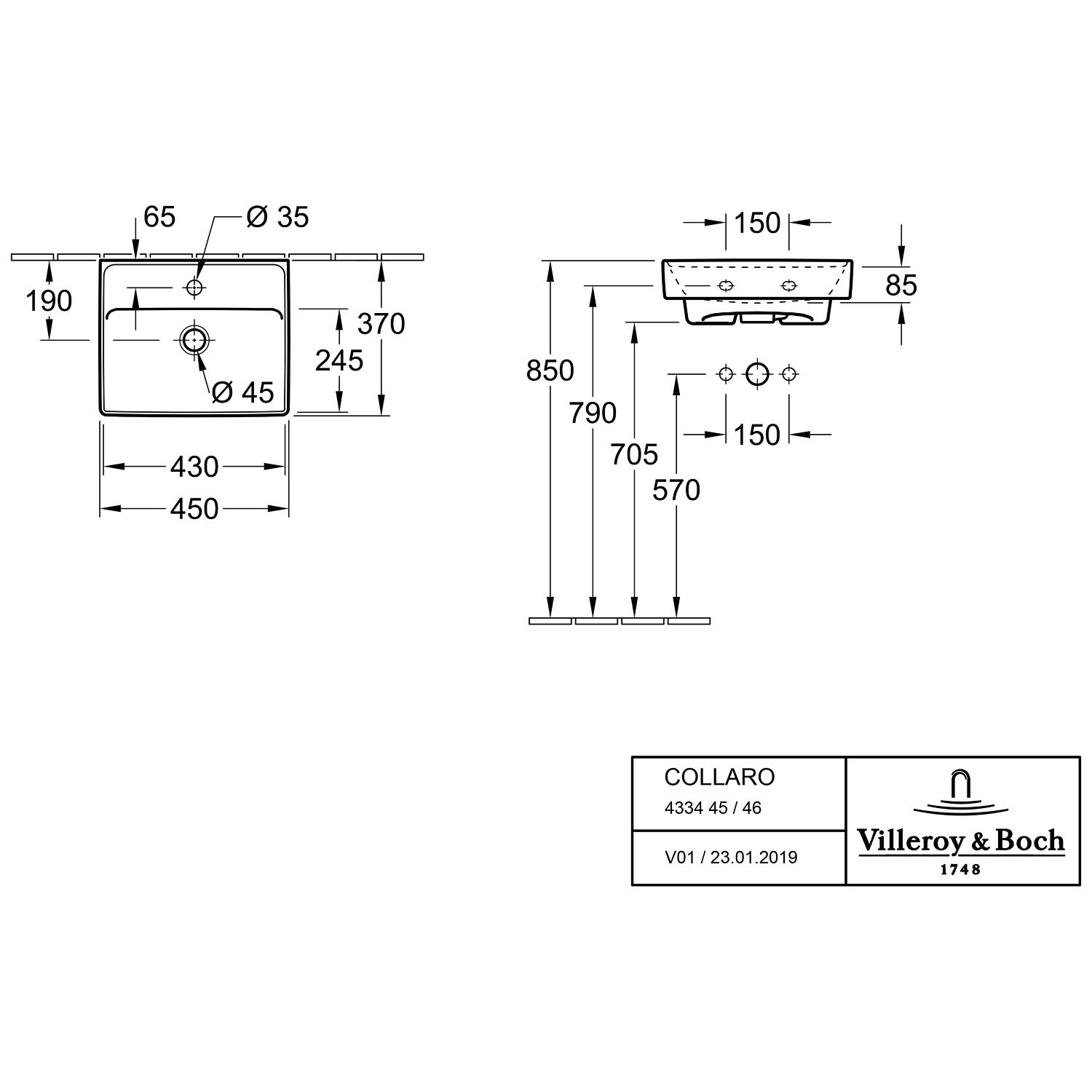 Villeroy & Boch Collaro Handwaschbecken 45 cm ohne Überlauf, 1 Hahnloch
