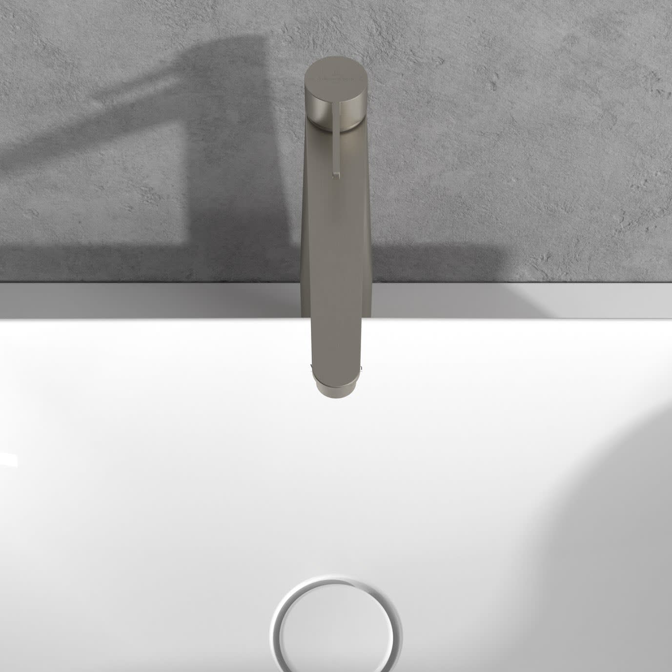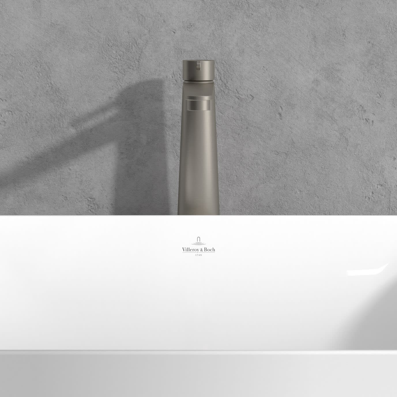Die Conum Einhebel-Waschtischarmatur von Villeroy & Boch: Ihre konische Formensprache besticht durch eine dynamische Eleganz, die jeden Tag aufsNeue fasziniert und dem Waschplatz einen einzigartigen Charakter verleiht. So präzise und kompromisslos wie das Designist auch die Verarbeitungsqualität, die höchste Standards repräsentiert. Der seitlich positionierte Hebel der Armatur aus hochwertigem Messing gleitet beim Öffnen sanft und liegt daher sehr gut in der Hand. Der innovativen Laminarstrahl wird nicht mit Luft vermischt. So ist er kristallklar, besonders leise und vermeidet unangenehme Wasserspritzer beim Händewaschen. Durch die komfortablen Armaturenhöhe entsteht zusätzlich eine besonders angenehme Waschposition durch viel Platz zwischen Auslauf und Waschtisch.