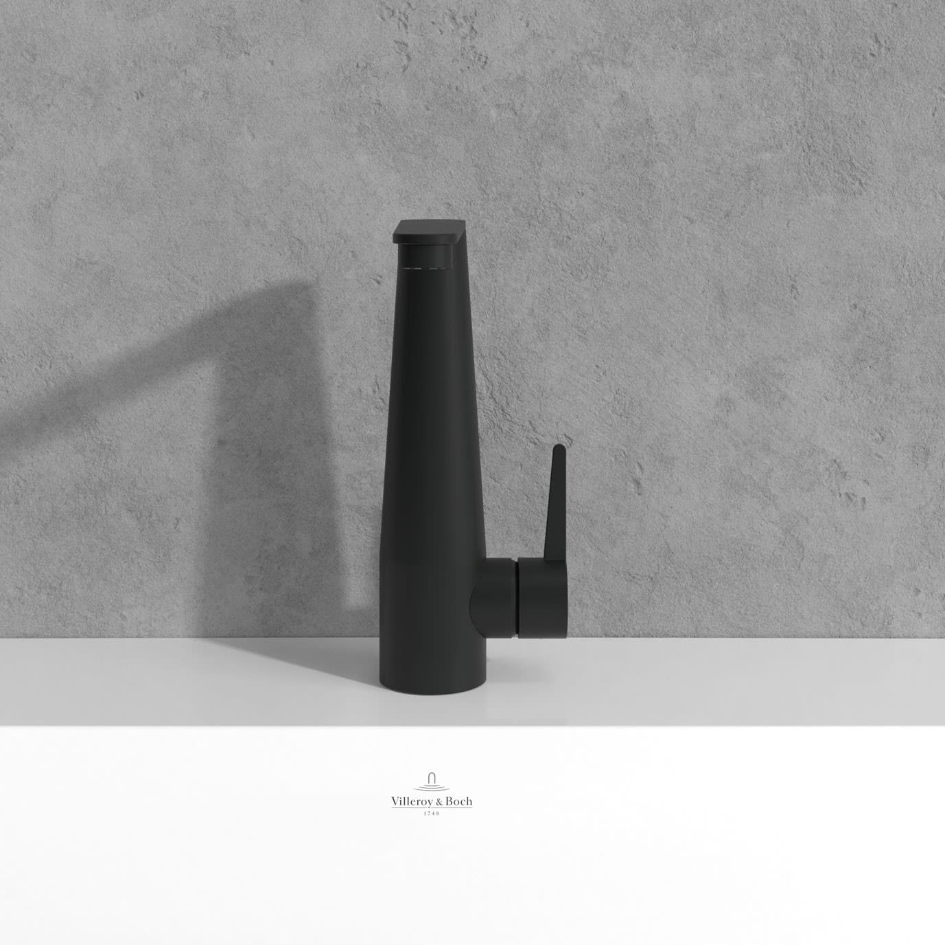 Die erhöhte Conum Einhebel-Waschtischarmatur von Villeroy & Boch: Ihre konische Formensprache besticht durch eine dynamische Eleganz, die jeden Tag aufsNeue fasziniert und dem Waschplatz einen einzigartigen Charakter verleiht. So präzise und kompromisslos wie das Designist auch die Verarbeitungsqualität, die höchste Standards repräsentiert. Der seitlich positionierte Hebel der Armatur aus hochwertigem Messing gleitet beim Öffnen sanft und liegt daher besonders gut in der Hand. Der innovativen Laminarstrahl wird nicht mit Luft vermischt. So ist er kristallklar, besonders leise und vermeidet unangenehme Wasserspritzer beim Händewaschen. Dazu trägt auch die besondere Armaturenhöhe bei – praktisch! Gleichzeitig bietet die Armatur eine umweltfreundliche Wasserbegrenzung auf maximal 5 l/min – ganz ohne Leistungsverlust.