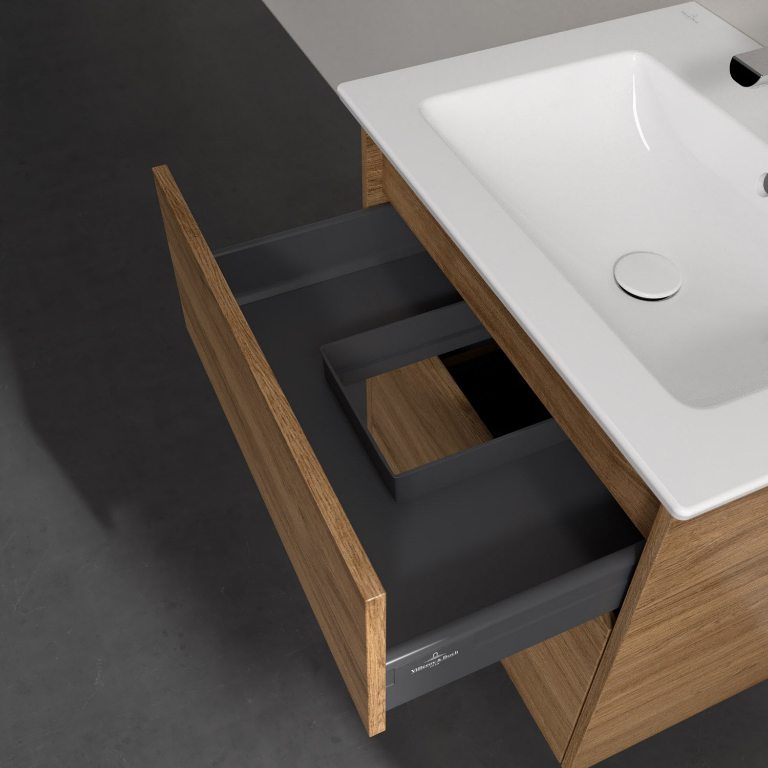 Stilsicher fügt sich der Finero Waschtischunterschrank von Villeroy & Boch mit seinem modernen, klaren Design in jedes Badezimmer ein. Seine beiden Auszüge verfügen über viel Platz für beispielsweise Handtücher, Föhn oder Pflegeprodukte aller Art. Durch die unterschiedliche Höhe eignet sich der obere Auszug besonders für kleinere, handlichere Gegenstände und im unteren können auch sperrigere Accessoires verstaut werden. Integriertem Antirutsch-Boden sei dank, bleiben diese auch am gewünschten Platz. Öffnen lassen sich die Auszüge bequem mit der innovativen Push-to-Open-Technologie – ein leichter Fingerdruck reicht aus . Geschmeidig sanft und leise gleiten sie anschließend über Selbsteinzug wieder zu.