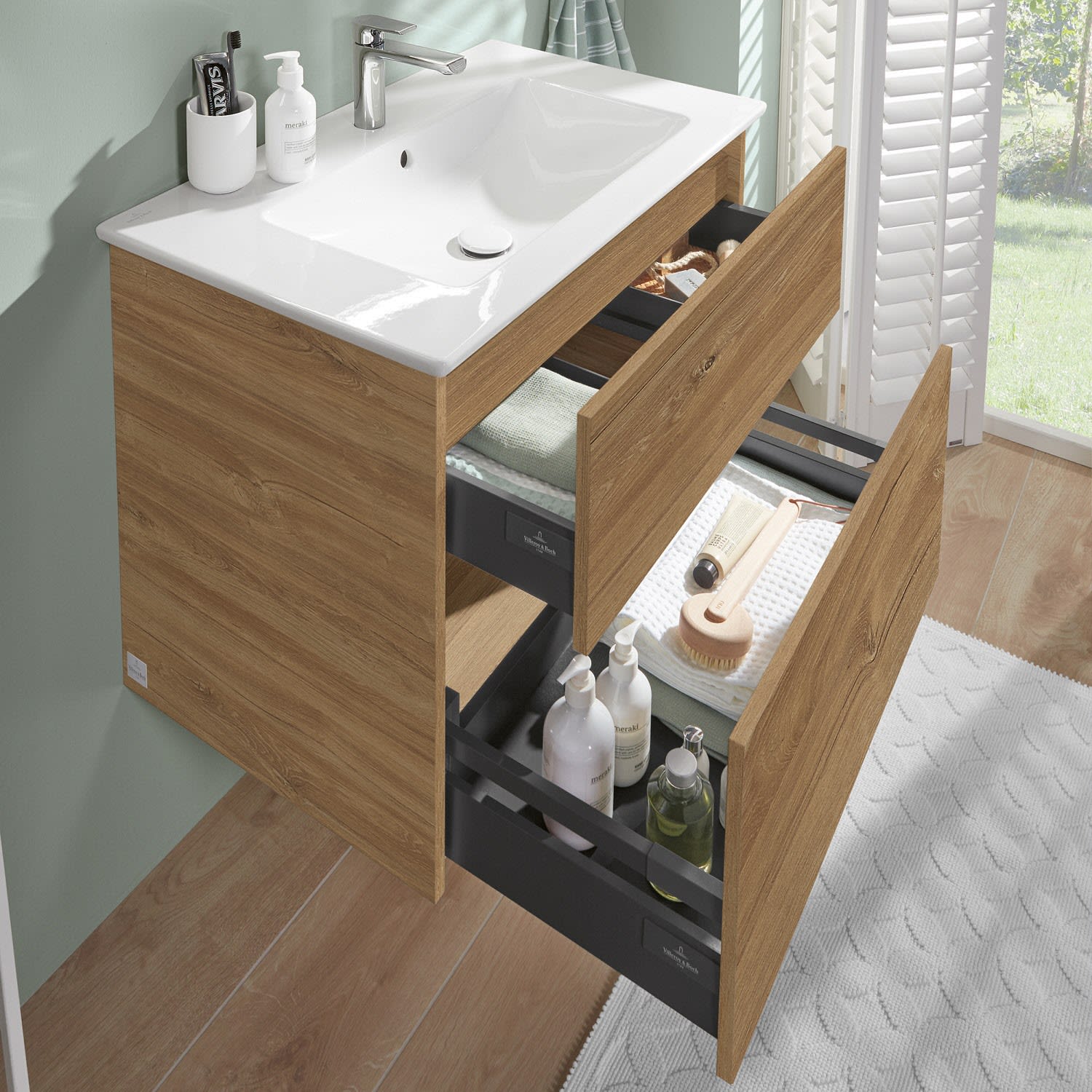 Stilsicher fügt sich der Finero Waschtischunterschrank von Villeroy & Boch mit seinem modernen, klaren Design in jedes Badezimmer ein. Seine beiden Auszüge verfügen über viel Platz für beispielsweise Handtücher, Föhn oder Pflegeprodukte aller Art. Durch die unterschiedliche Höhe eignet sich der obere Auszug besonders für kleinere, handlichere Gegenstände und im unteren können auch sperrigere Accessoires verstaut werden. Integriertem Antirutsch-Boden sei dank, bleiben diese auch am gewünschten Platz. Öffnen lassen sich die Auszüge bequem mit der innovativen Push-to-Open-Technologie – ein leichter Fingerdruck reicht aus . Geschmeidig sanft und leise gleiten sie anschließend über Selbsteinzug wieder zu.